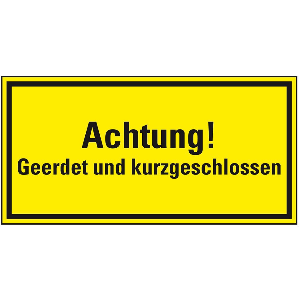 Hinweisschild Achtung! - Geerdet und kurzgeschlossen, gemäß ASR A1.3, für den Innen- und begrenzten Außeneinsatz, Material: selbstklebende Folie, temperaturbeständig von -40 bis +80°C, resistent gegen viele Chemikalien, Format: 200 x 100 mm