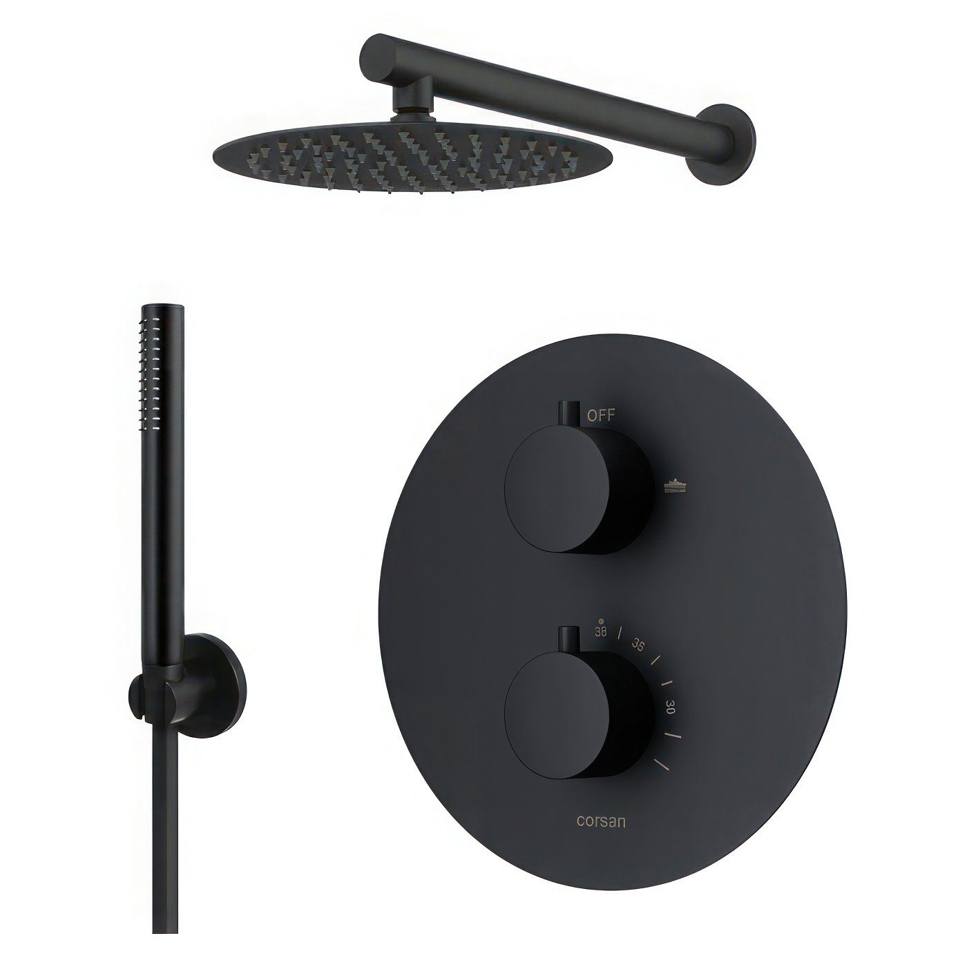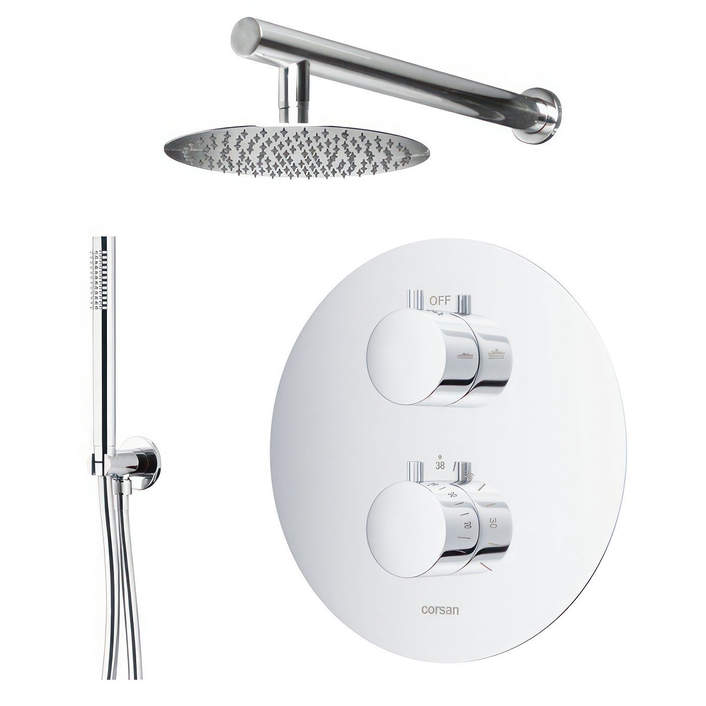 Das Set besteht aus einer Regenbrause, Handbrause mit Schlauch, Griff und Unterputzmischer.