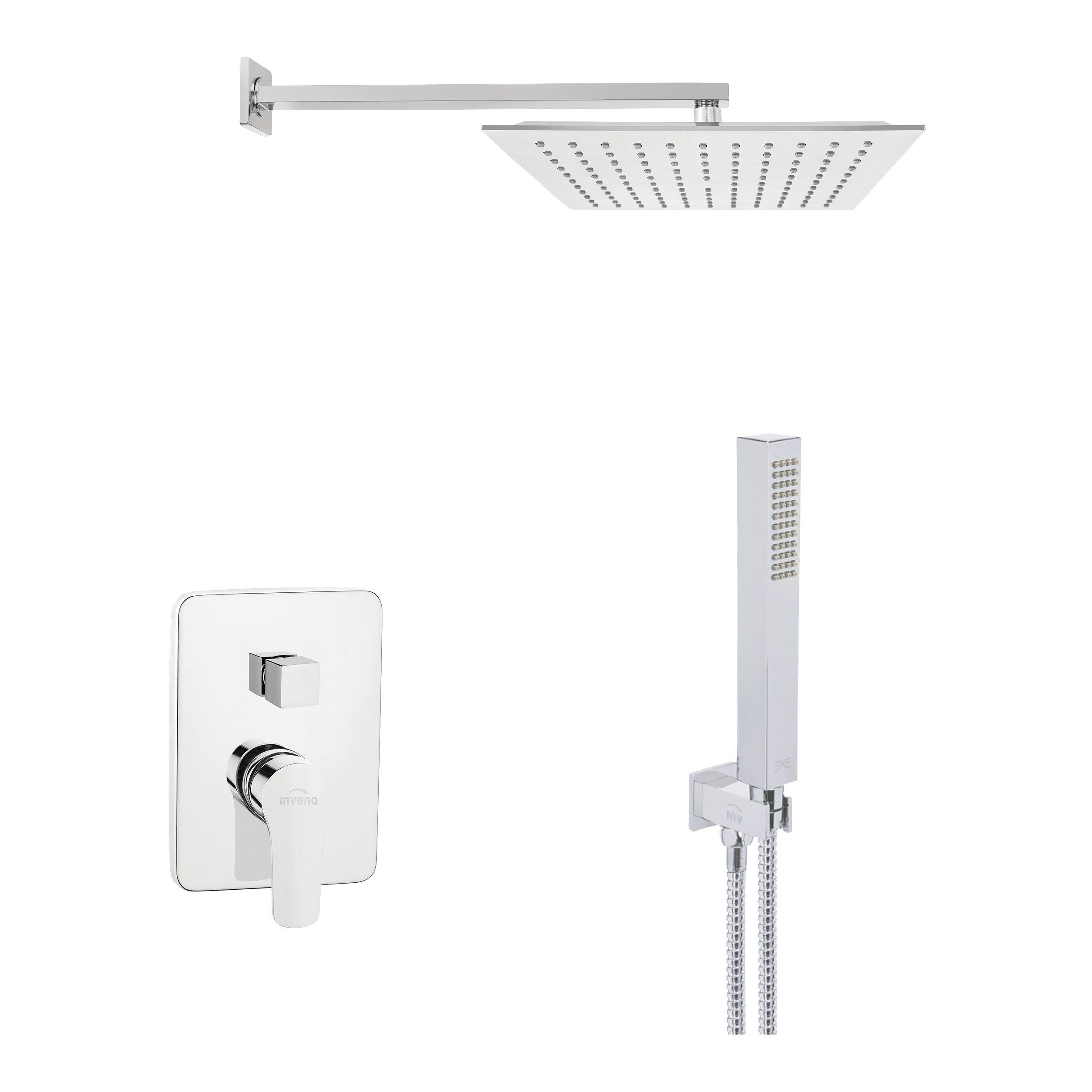 Das Set besteht aus einer Regenbrause, Handbrause mit Schlauch, Griff und Unterputzmischer.