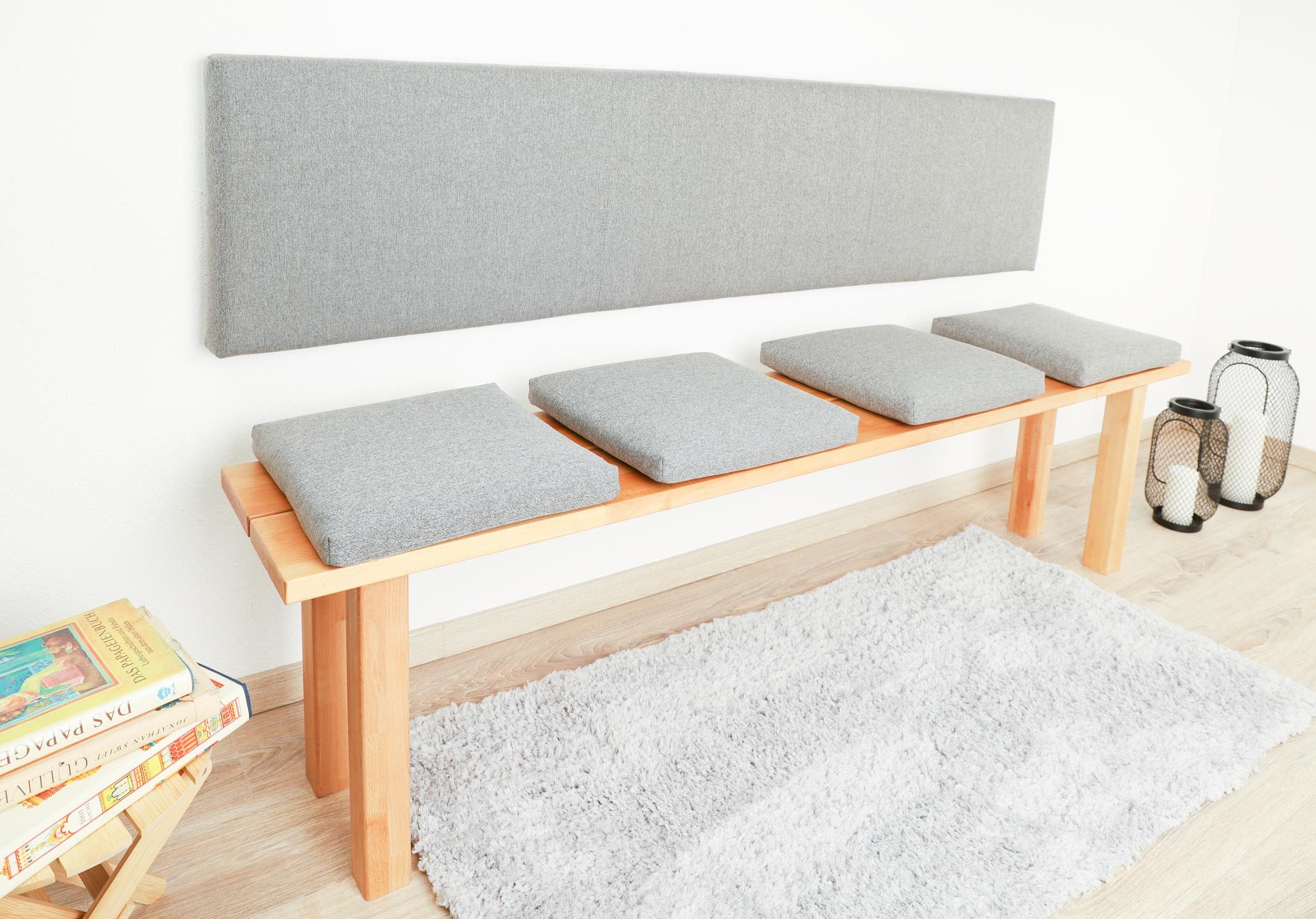 Mit dem Wandpolster "TITAN" gestalten Sie schnell & einfach Sitzgruppen nach Ihren Wünschen. Ob als Rückwand einer Bank, Wandschutz im Flur oder als Wandpaneele im Kinderzimmer - Das ca. 5cm dicke Polster liefern wir in Ihrer Wunschfarbe und Breite passend für jede Anforderung. Die Lieferung beinhaltet das abgebildete Wandkissen, ohne Sitzkissen. Der Stoffbezug (100% Polyester) kann vollständig vom Schaumstoff abgenommen und bei 40° in der Waschmaschine gewaschen werden. Auch die Montage gestaltet sich denkbar einfach per Klett und Flausch. Zusätzlich sind Ösen am Kissen angebracht, so können Sie es auch mit Wandhaken befestigen, das eignet sich besonders für unebene Untergründe. Die benötigten Wandhaken liegen der Lieferung bei. Die Höhe beträgt ca. 40cm. Optional erhalten Sie passende Sitzauflagen "MARS"