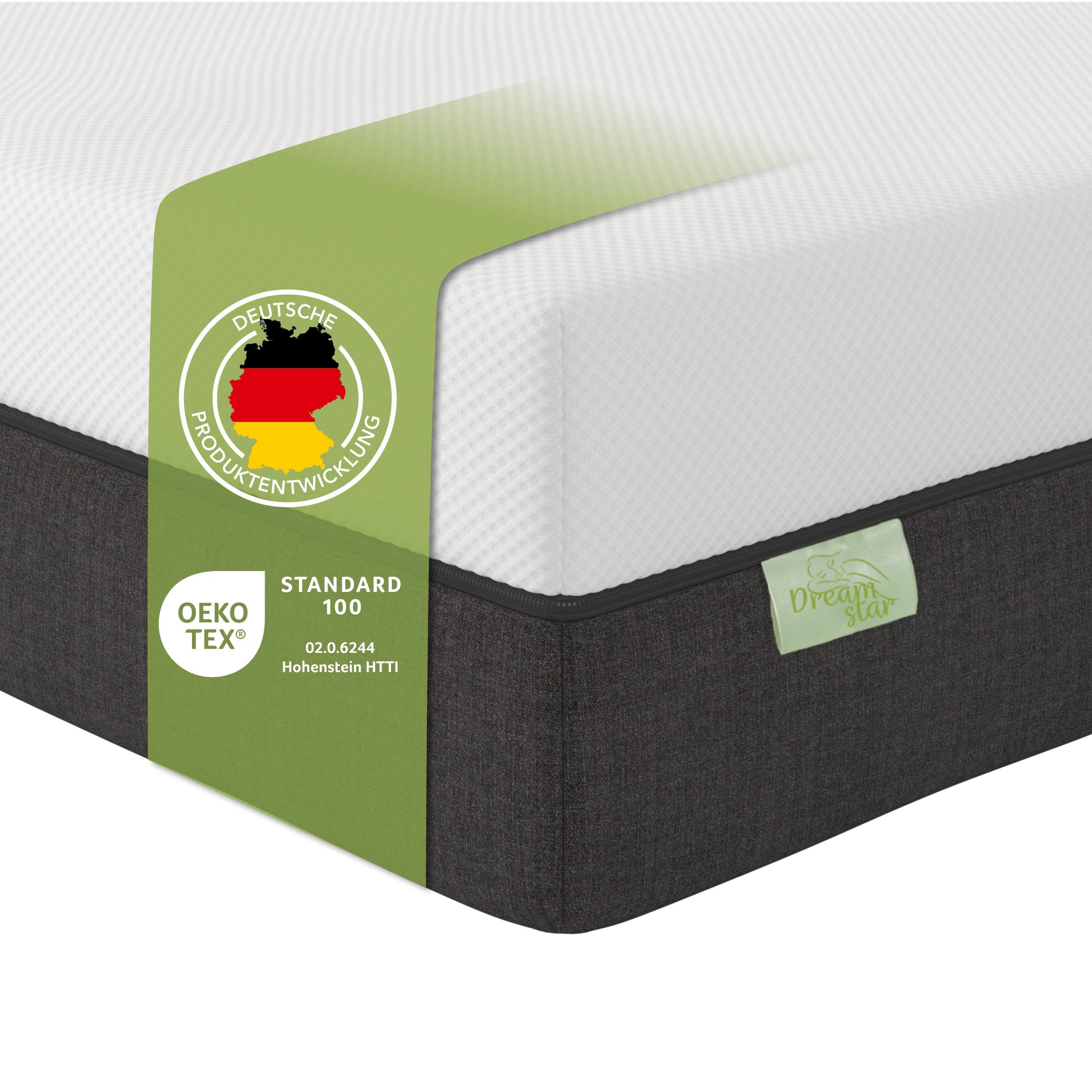 Die Kaltschaummatratze Dreamstar Sky Flex ist insgesamt ca. 18 cm hoch. Der Matratzenkern besteht aus einem Kaltschaumkern mit einseitigem 7-Zonen-Schnitt und Gelschaumauflage. Dies ermöglicht zum einen eine hohe Punktelastizität und zum anderen eine ausgezeichnete Anpassung an den Körper. Die Matratze vereint zwei Härtegrade in einer. Durch einfaches Wenden des Kerns können Sie zwischen einer H2 und einer H3 Seite wählen.