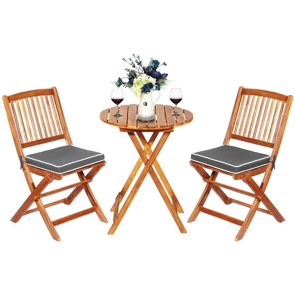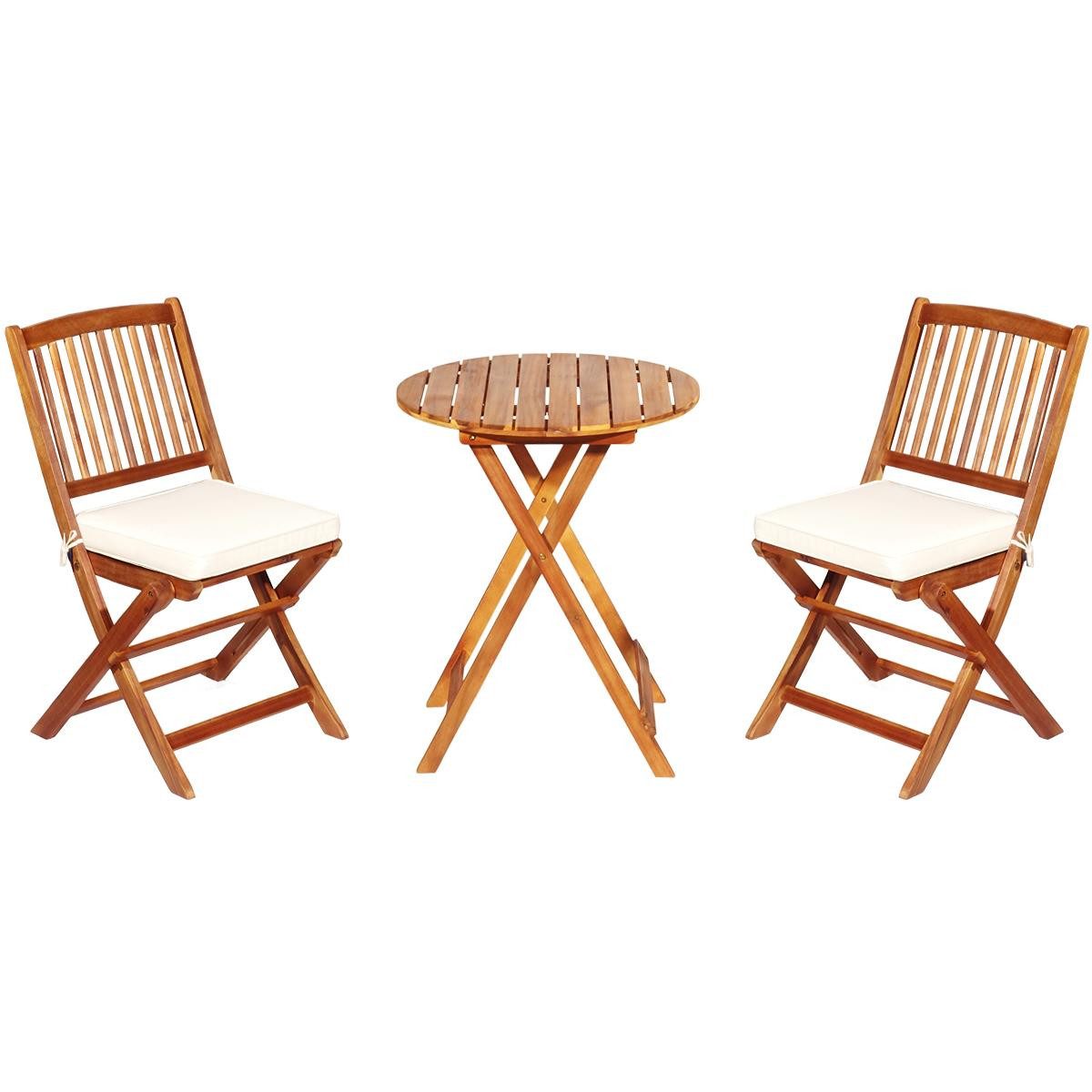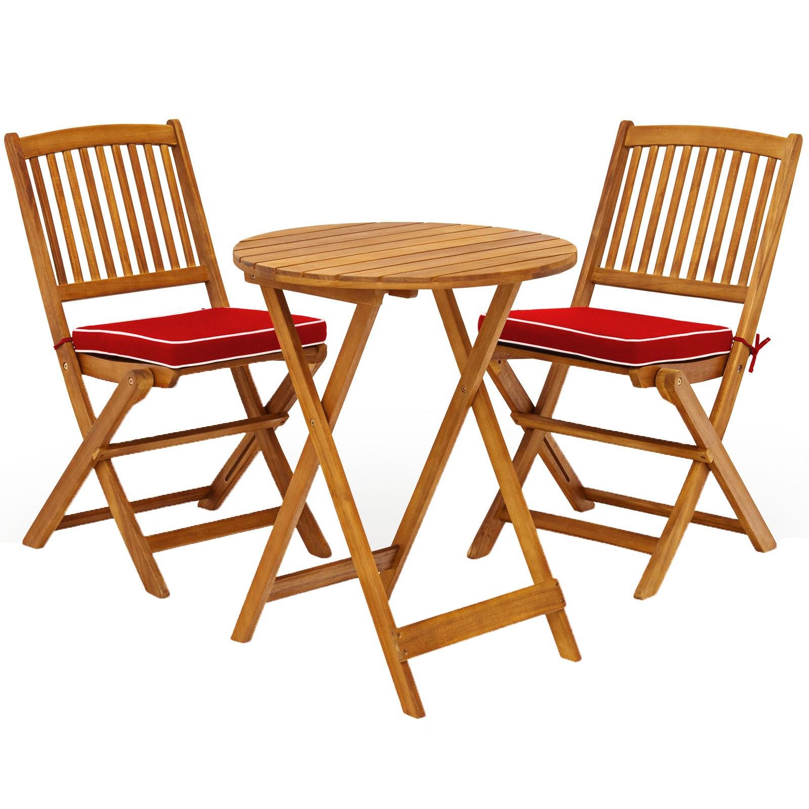 Mit dem 3 tlg. Bistro Set von KOMFOTTEU steht schönen Sommernachmittag nichts mehr im Weg! Unser 3 er Set Gartenmöbel Set beinhaltet 1 runden Gartentisch und 2 Stühle mit Kissen, die einen bequemen Platz für die Freizeit mit Freunden und Familie schaffen. Dieses Balkon Set ist aus 100% massivem Akazienholz gefertigt, ist wasserdicht, wetterfest, robust und langlebig. Die gebogenen Rückenlehnen bieten eine hervorragende Unterstützung und lindern Rückenschmerzen. Dank der Strukturen mit den X-förmigen Halterungen ist der Tisch bis zu 40 kg belastbar und kann Speisen und Getränke abgestellt werden und jeder Stuhl ist bis zu 160 kg belastbar und garantiert maximale Sicherheit. Darüber hinaus lässt sich dieses Terrassenholz-Set in wenigen Sekunden auf- und zusammenklappen.