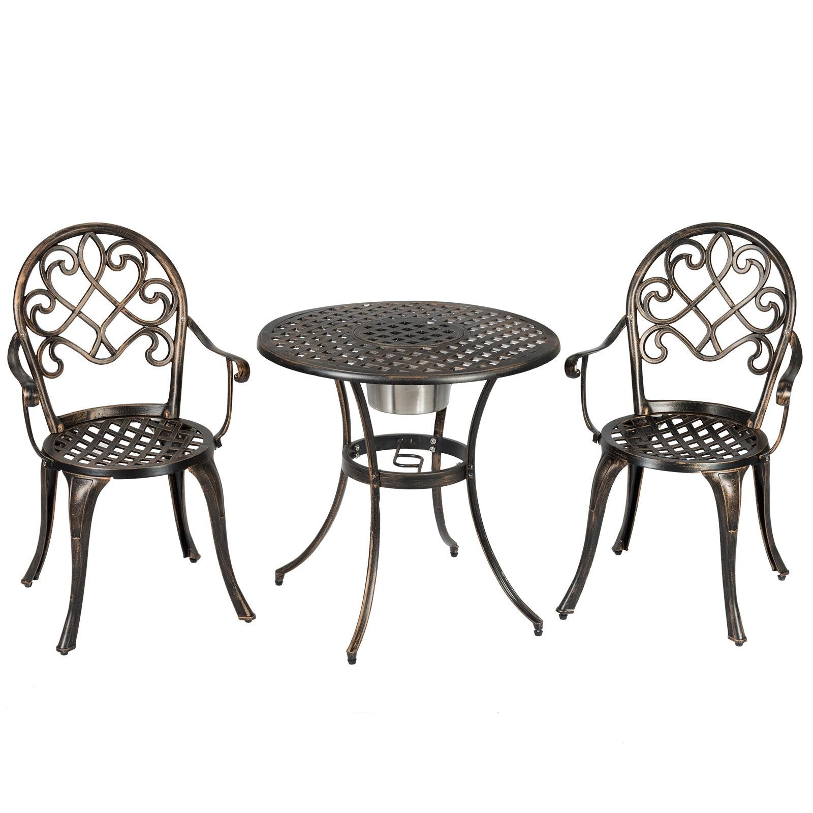 Dieses outdoor Bistro Set besteht aus massivem Aluminiumguss, der rostfrei, wetterfest und lichtbeständig ist. Dieser Tisch enthält einen Eiskübel, um Ihre Getränke an heißen Sommertagen kühl zu halten. Bitten Sie einfach Ihren Partner oder einen Freund, eine perfekt gekühlte Flasche Ihres Lieblings-Champagners, -Biers oder -Limos zu genießen! Ergonomisch Armlehnen und Sitze sorgen für ein angenehmes und entspanntes Körpergefühl. Das Loch unter dem Tisch bietet Platz für einen Sonnenschirm (nicht enthalten) für bequemen Schatten und kühle Entspannung. Perfekt für jeden Raum im Außen- und Innenbereich, wie z. B. Garten, Terrasse, Balkon, Gartenpool oder Veranda.