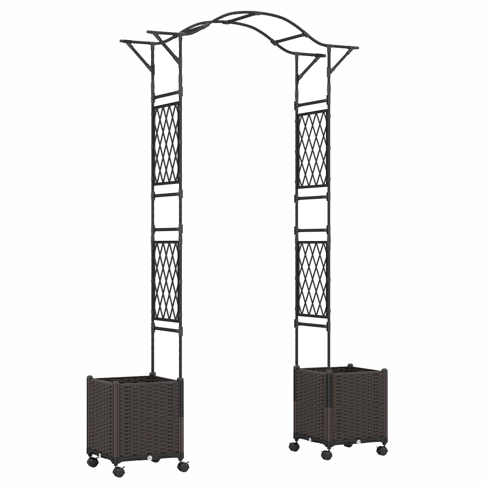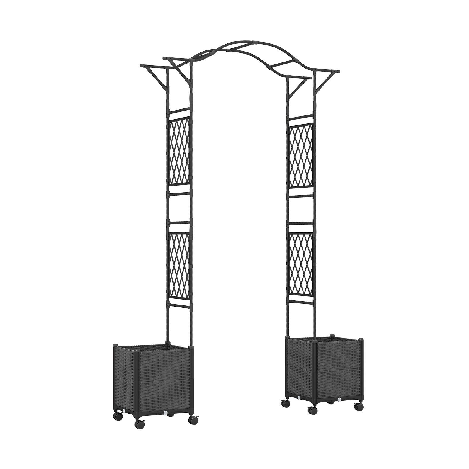Verleihen Sie Ihrem Garten mit unserem Rosenbogen mit Pflanzgefäßen Eleganz und Lebendigkeit. Dieses innovative Bogen-Set kombiniert geschickt ein Rankgitter und 2 Pflanzgefäße, die es Ihnen ermöglichen, sowohl Ihre Lieblingspflanzen zu kultivieren als auch eine vertikale Landschaft zu schaffen. Das Wasseraufbewahrungs- und Drainagesystem bietet den Pflanzen eine ideale Wachstumsumgebung und reduziert den Wartungsaufwand. Die PE-Beschichtung und das hochwertige PP-Material gewährleisten, dass es nicht rostet oder sich bei längerem Außeneinsatz verformt. Ob Pflanzenanbau oder die Dekoration eines romantischen Hochzeitsbogens, es wird Ihrem Event einen einzigartigen Charme verleihen!