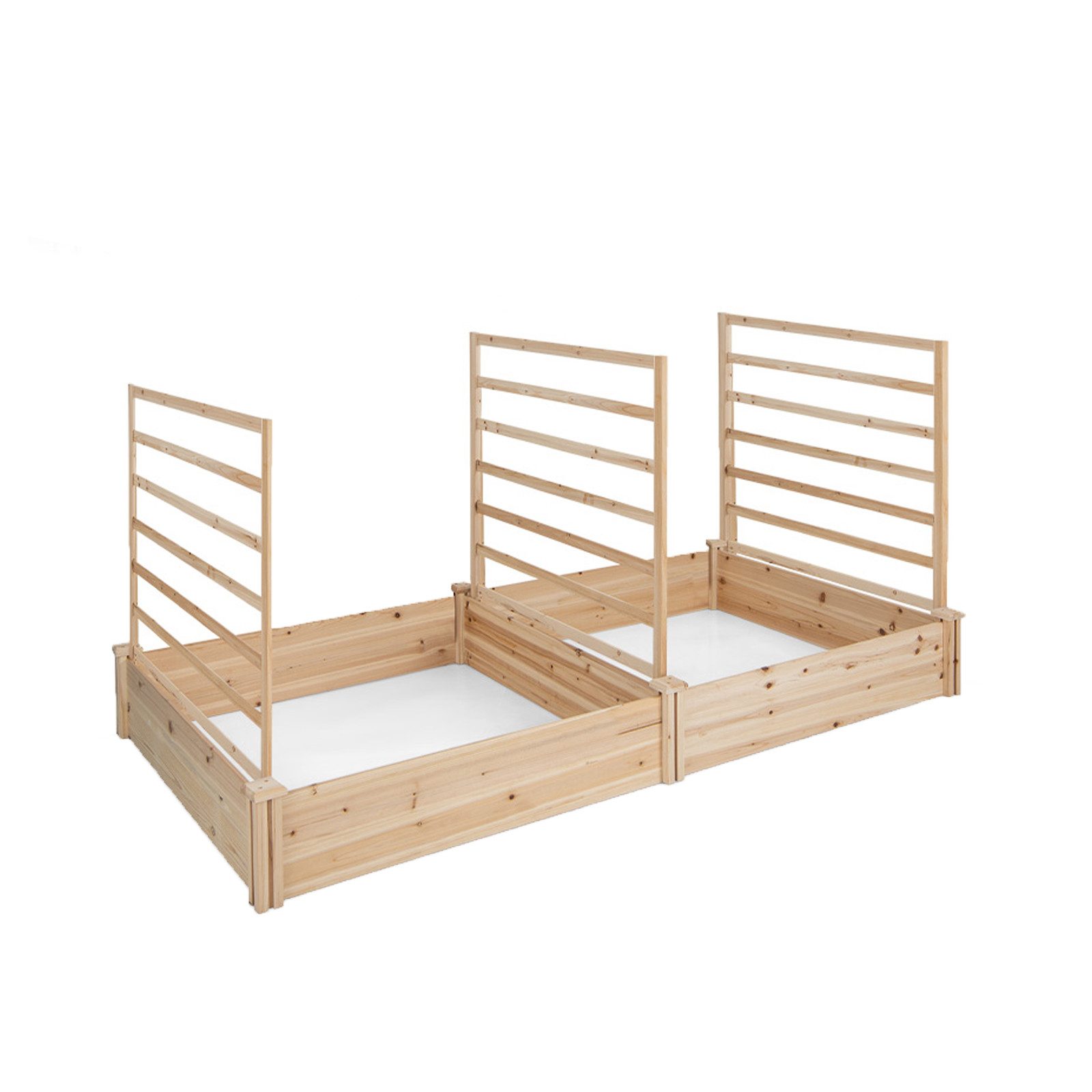 Das erhöhte Gartenbeet verfügt über 2 Pflanzkästen und 3 Rankgitter, die es Ihnen ermöglichen, verschiedene Pflanzenarten wie Gemüse, Obst, Kräuter, Blumen und Kletterpflanzen zu kultivieren. Das Holzgartenbeet bietet insgesamt eine Kapazität von 0,6 m3 und bietet reichlich Platz für das Gedeihen von Pflanzen. Was unser Gartenbeet auszeichnet, ist seine Flexibilität, da die 3 Rankgitter in mehreren Konfigurationen nach Ihren persönlichen Vorlieben positioniert werden können. Hergestellt aus umweltfreundlichem Tannenholz zeigt der erhöhte Pflanzkasten beeindruckende Deformationsbeständigkeit. Die natürliche Holzoberfläche ermöglicht es Ihnen außerdem, sie mit Ihren bevorzugten Farben zu bemalen. Der Outdoor-Gartenbeet verfügt über einen offenen Boden, um das Wachstum der Pflanzen zu fördern, was sicherstellt, dass Ihre Pflanzen richtig bewässert werden und Nährstoffe erhalten. Dank der 4-fach geschlitzten Beine können Sie mehrere Einheiten miteinander verbinden, um den Gartenpflanzer nach Ihren Wünschen anzupassen oder zu erweitern.