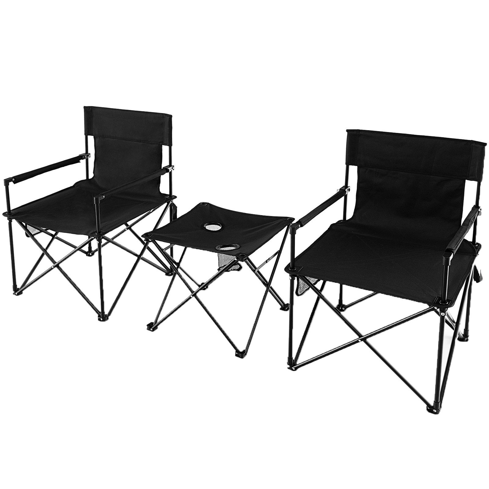 Dieses wetterfeste Tisch- und Stuhlset für den Außenbereich ist der perfekte Ort für Ihre Interaktionen im Freien. Hergestellt aus verschleißfestem und wetterfestem Polyestergewebe, verfügt das Camping Tisch- und Stuhlset über eine ergonomische Rückenlehne und gepolsterte Armlehnen für bequemen Halt. Und die robusten Metallstangen und die X-förmige Beinstruktur sorgen für Stabilität und Festigkeit, während die rutschfesten Füße zusätzliche Sicherheit bieten. Außerdem bieten seitliche Ablagefächer und 2 Becherhalter auf der Tischplatte Stauraum. Natürlich lässt sich das Set aus Picknicktisch und -stühlen leicht zusammenklappen und so verstauen. Und die mitgelieferte Tragetasche sorgt für einen bequemen Transport.