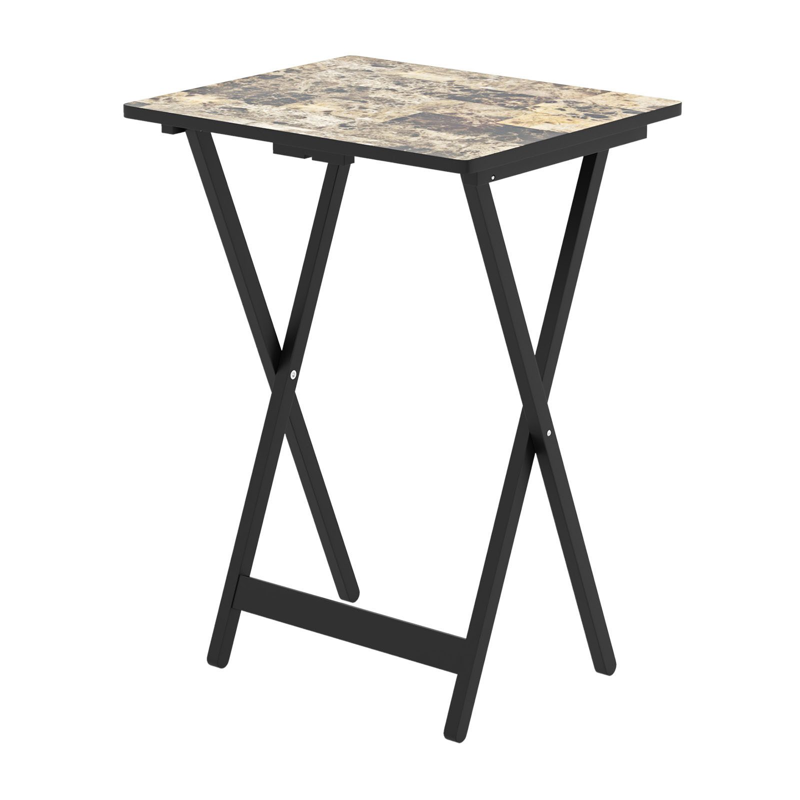 Das faltbare Design und der integrierte Tragegriff ermöglichen einfachen Transport von Raum zu Raum oder sogar ins Freie. Außerdem hilft das enthaltene Aufbewahrungsregal dabei, die faltbaren Tische ordentlich zu organisieren, wenn sie nicht in Gebrauch sind. Die Kombination aus Gummiholzrahmen und X-förmiger Querverstrebung bietet eine robuste und stabile Basis. Die faltbaren Snacktische verfügen über eine schicke Nachbildung von Marmor, die Eleganz mit Praktikabilität kombiniert. Diese Tische sind vielseitig einsetzbar, von einem gemütlichen Sofa-Seitentisch bis hin zu einer tragbaren Servierlösung für Innenund Außenbereiche.