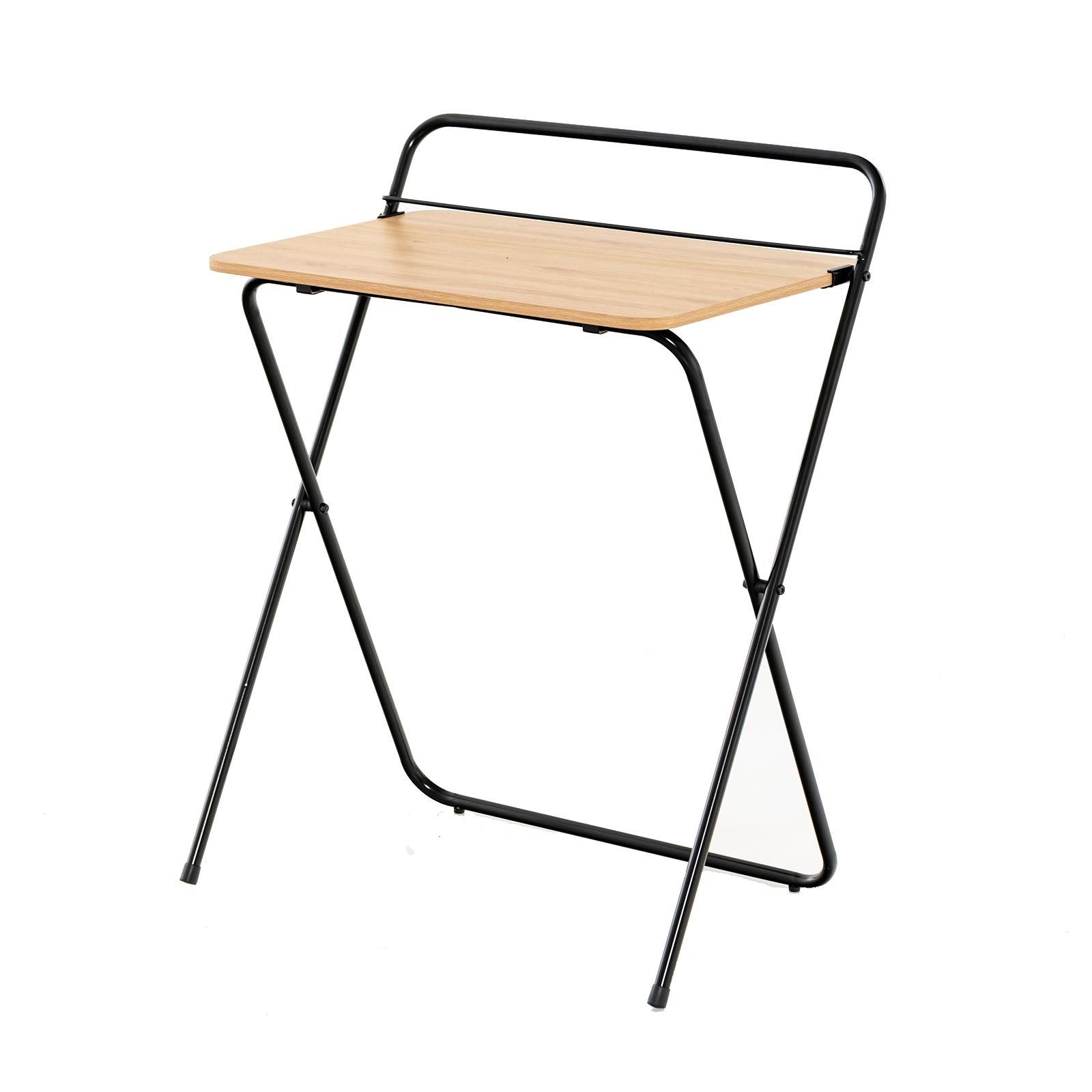 Unser klappbarer Mini Computertisch ist die ideale Lösung für engen Raum, um Platz zu sparen. Mit seiner kompakten Silhouette im zusammengeklappten Zustand passt er mühelos in kleine Räume. Vormontiert und innerhalb von Sekunden aufgestellt, bietet er eine richtige Arbeitsfläche von 60 x 40 cm und einen integrierten Ständer für bequemes Lesen oder die Nutzung Ihres Tablets. Robustheit und Standfestigekeit sind dank des X-förmigen Metallrahmens und der rutschfesten Füße garantiert. Funktionale Eleganz und natürliche Holzoptik bereichern Ihren Alltag. Entscheiden Sie sich für unseren klappbaren Tisch und arbeiten, studieren oder kreieren Sie, wo auch immer Sie sind.