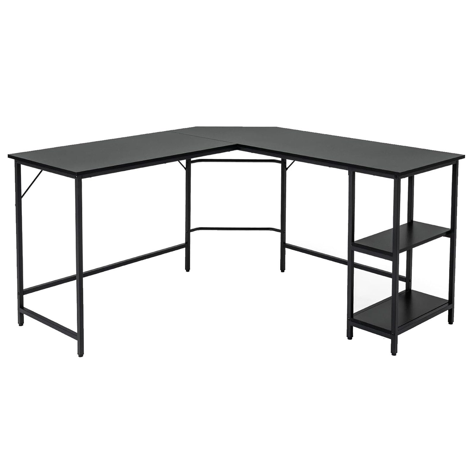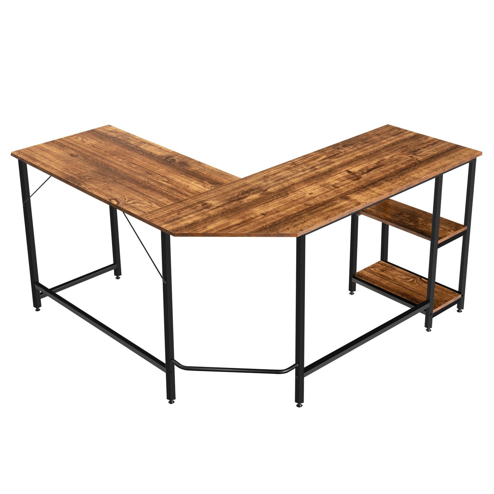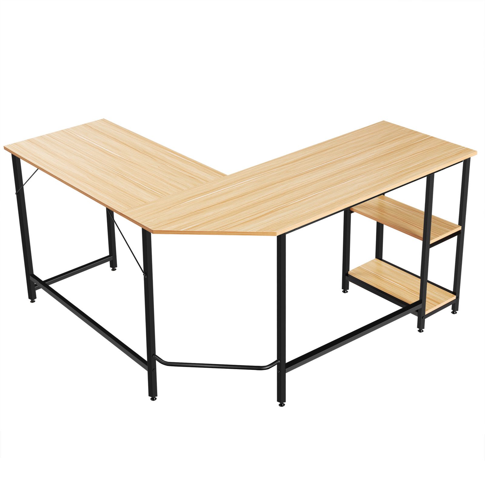 Was man zuerst die Augen fingt, ist das L-förmige Design des Computertisches. Er passt somit perfekt an der Ecke jedes Zimmers. Zudem können Sie dank des Designs Ihre Beine bequem gerade strecken. Die große Tischplatte bietet viel Plätze für Ihren Monitor oder Laptop und dient zum Organisieren Ihrer Büchern, Dokumenten, Büromaterial oder zum Anzeigen Ihrer Alben. Die zwei Ablagen unter dem Tisch bieten ausreichend Platz zum Verstauen Ihrer persönlichen Gegenstände und andere Bürosachen. Für die Stabilität sorgen die Körper aus Spanplatten und das Gestell aus Eisen. Eine stilvolle und funktionelle Ergänzung für Ihr Arbeitszimmer, Büro, Wohnzimmer-der Schreibtisch.