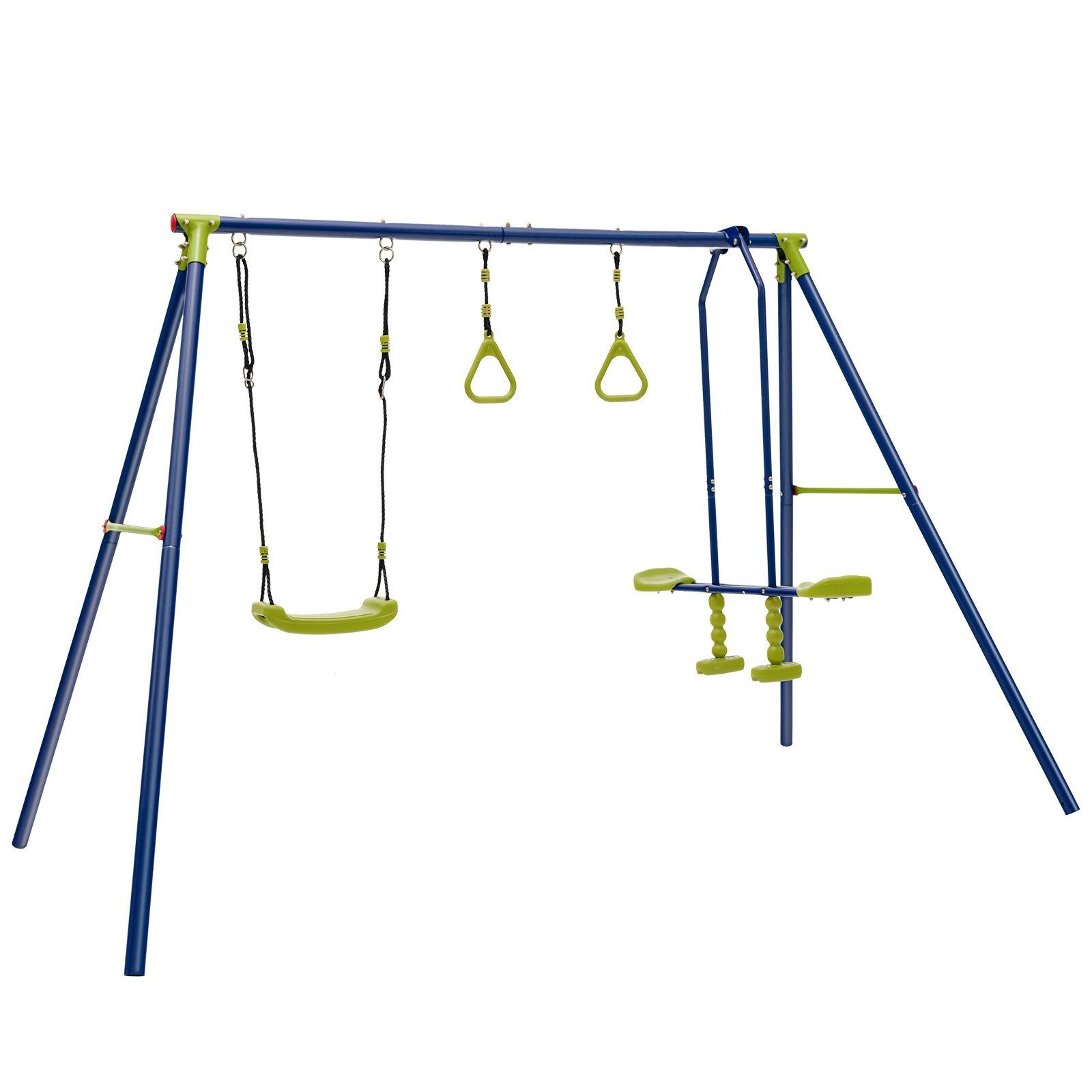 Dieses multifunktionale Spielset zeichnet sich durch einen A-förmigen Rahmen aus, der es stabil zum Spielen macht. Zusätzlich sorgen seitliche Querstreben auf beiden Seiten für weitere Stabilität. 4 Erdspieße fixieren die Schaukel zusätzlich am Boden. Unser vielseitiges Schaukelset besteht aus 1 Schaukelsitz, 1 Wippe und 2 Turnringen, damit Kinder mit ihren Freunden trainieren und spielen können. Sie können die Длина des Schaukelseils von 88 cm bis 128 cm einstellen, um es an Ihre wachsenden Kinder anzupassen. Sein Glatter U-förmiger Sitz und die Wippe sorgen für ein angenehmes Spielerlebnis. Es wird ein sicherer und lustiger Spielplatz für Kinder sein, um mit ihren Freunden (nicht mehr als 4 Kinder) im Hinterhof, Garten, Park, auf dem Rasen und mehr zu spielen.