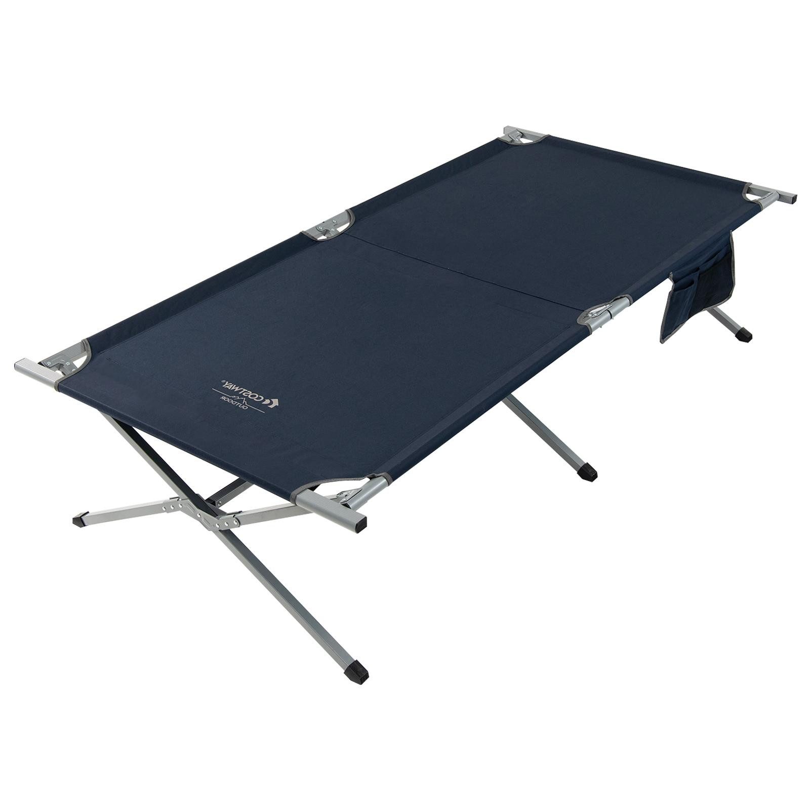 Packen Sie ein und gehen Sie mit unserem klappbaren Campingbett! Das extrabreite Bett sorgt für einen ruhigen Schlaf und verhindert, dass Sie zu Boden fallen. Außerdem gibt es an der Seite des Bettes eine Aufbewahrungstasche für Handy, Zeitschriften, Brillen usw. Die Stützbeine und der Rahmen des Klappbetts bestehen aus Stahl bzw. Aluminium, die stark genug sind, um bis zu 150 Kg zu tragen. Jedes Stützbein hat rutschfeste Polster, um die Stabilität des Bettes weiter zu verbessern. Das klappbare Campingbett erfordert nur einen einfachen Aufbau. Das Zusammenklappen ist genauso einfach und Sie können es platzsparend in einer Ecke platzieren. Ausgestattet mit einer Tragetasche ist unser Schlafbett perfekt, um es auf ein Outdoor-Abenteuer mitzunehmen!