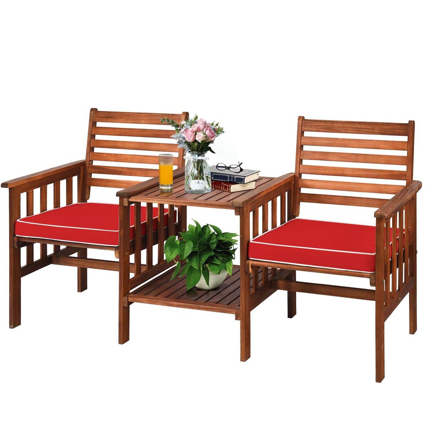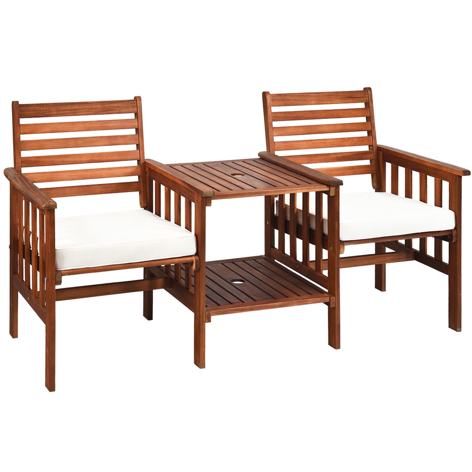 Diese Gartenbank ist aus massivem, wetterbeständigem, natürlichem Akazienholz für Schönheit und lange Haltbarkeit gefertigt. Unsere Sitzgruppe bietet ein benutzerfreundliches Design zum Hinzufügen eines Tisches zwischen diesen 2 Sitzen und bietet Ihnen bequemen Zugriff auf das, was Sie brauchen, wie 2 Tassen Tee oder mehrere Bücher. Mit einem Mittelloch im kleinen Tisch können Sie einen Sonnenschirm zum Schutz vor Sonne oder Regen einsetzen. Dieses Gartenmöbel-Set ist mit weichen und dicken Schwammkissen ausgestattet, um Ihnen ein angenehmes Sitzerlebnis zu bieten. Und die abnehmbaren Bezüge mit Reißverschluss erleichtern die tägliche Reinigung.