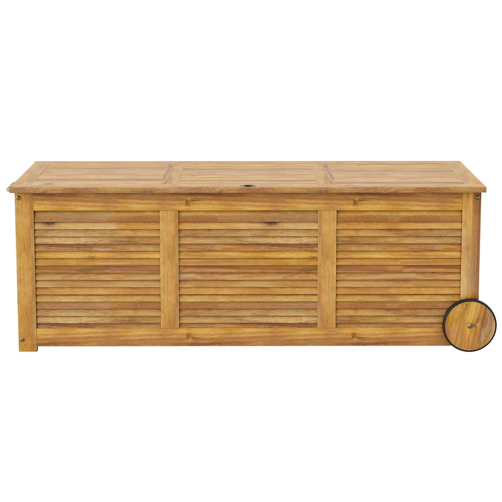Befreien Sie jetzt Ihren Innen- oder Außenbereich von Unordnung mit unserer großen Holzdeckbox. Mit einem Fassungsvermögen von 182L eignet sich die Outdoor-Aufbewahrungsbox ideal zur Aufbewahrung von Gartenzubehör, Terrassen-Sitzkissen, Sportgeräten, Poolzubehör, Werkzeugen und vielem mehr! Hergestellt aus naturbelassenem Akazienholz ist die Holzdeckbox langlebig und robust. Das lamellenartige Rahmenprofil gewährleistet zudem eine bessere Belüftung, um unangenehme Gerüche im Inneren zu verhindern. Noch besser ist, dass sie mit 2 reibungslosen Rädern und einem Seitenhandgriff ausgestattet ist, was Ihnen das einfache Bewegen ermöglicht. Wenn sie nicht in Gebrauch ist, kommt die mitgelieferte wasserdichte Stoffabdeckung gut gelegen, um die Deckenbox vor direkter Sonneneinstrahlung oder Wasserschäden zu schützen.