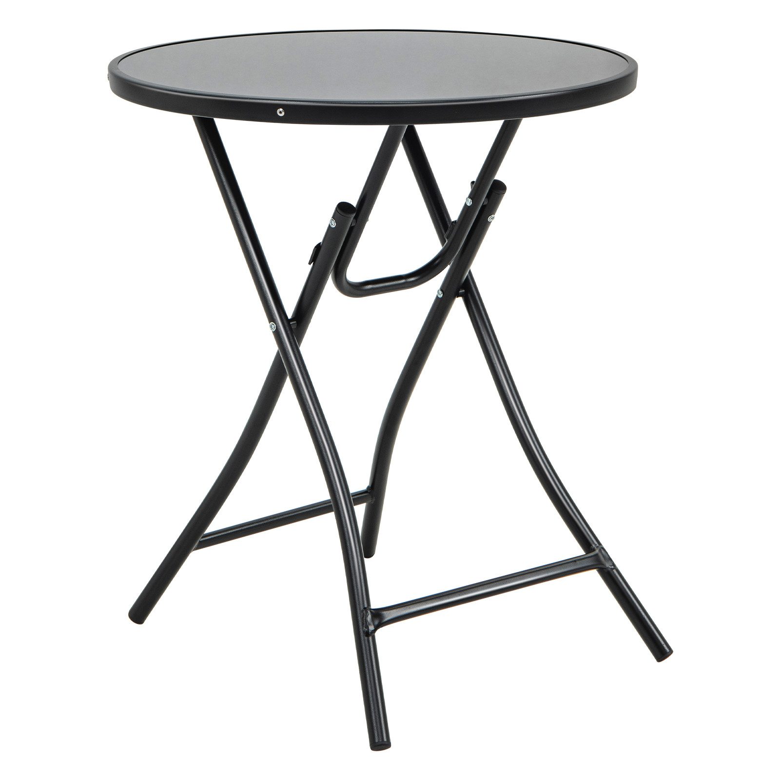 Verschönern Sie den Charme und Komfort Ihres Außenbereichs mit unserem runden Klapptisch! Dieser Terrassen-Bistrotisch verfügt über eine Tischplatte aus gehärtetem Glas, die sowohl langlebig als auch leicht zu reinigen ist. Sie müssen sich keine Sorgen machen, dass verschüttete Flüssigkeiten oder Flecken die Oberfläche beschädigen, da das Glas einfach mit einem feuchten Tuch abgewischt werden kann. Die runde Form des Tisches ermöglicht ein einfaches Gespräch und gemeinsames Essen und Trinken. Darüber hinaus sorgt der stabile Metallrahmen für Stabilität und Halt der Tischplatte. Und das Gestell verfügt außerdem über einen Klappmechanismus, sodass Sie diesen tragbaren Outdoor-Bistrotisch bei Nichtgebrauch einfach verstauen können.