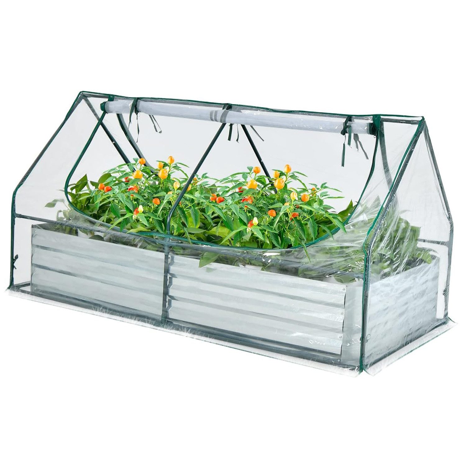 Die doppelte Schutzabdeckung aus hochwertigem und strapazierfähigem PVC-Gewebe und atmungsaktivem Netz sowie das robuste Beet aus verzinktem Stahl bieten Ihren Pflanzen einen sicheren und komfortablen Platz zum Wachsen. Außerdem erleichtern die beiden Fenster mit Reißverschluss an der Abdeckung das tägliche Gießen Ihrer Pflanzen, während der offene Boden des Beetes eine gute Entwässerung und Bewurzelung fördert, so dass Ihre Pflanzen kräftiger wachsen können. Bei schlechtem Wetter bietet dieses Gartengewächshaus Ihren Pflanzen eine warme und sichere Umgebung zum Wachsen. Und bei schönem Wetter kann das Gartenbeet ohne Schutzabdeckung dem direkten Sonnenlicht und der Luft ausgesetzt werden, was die Bestäubung und Duftverbreitung ermöglicht.