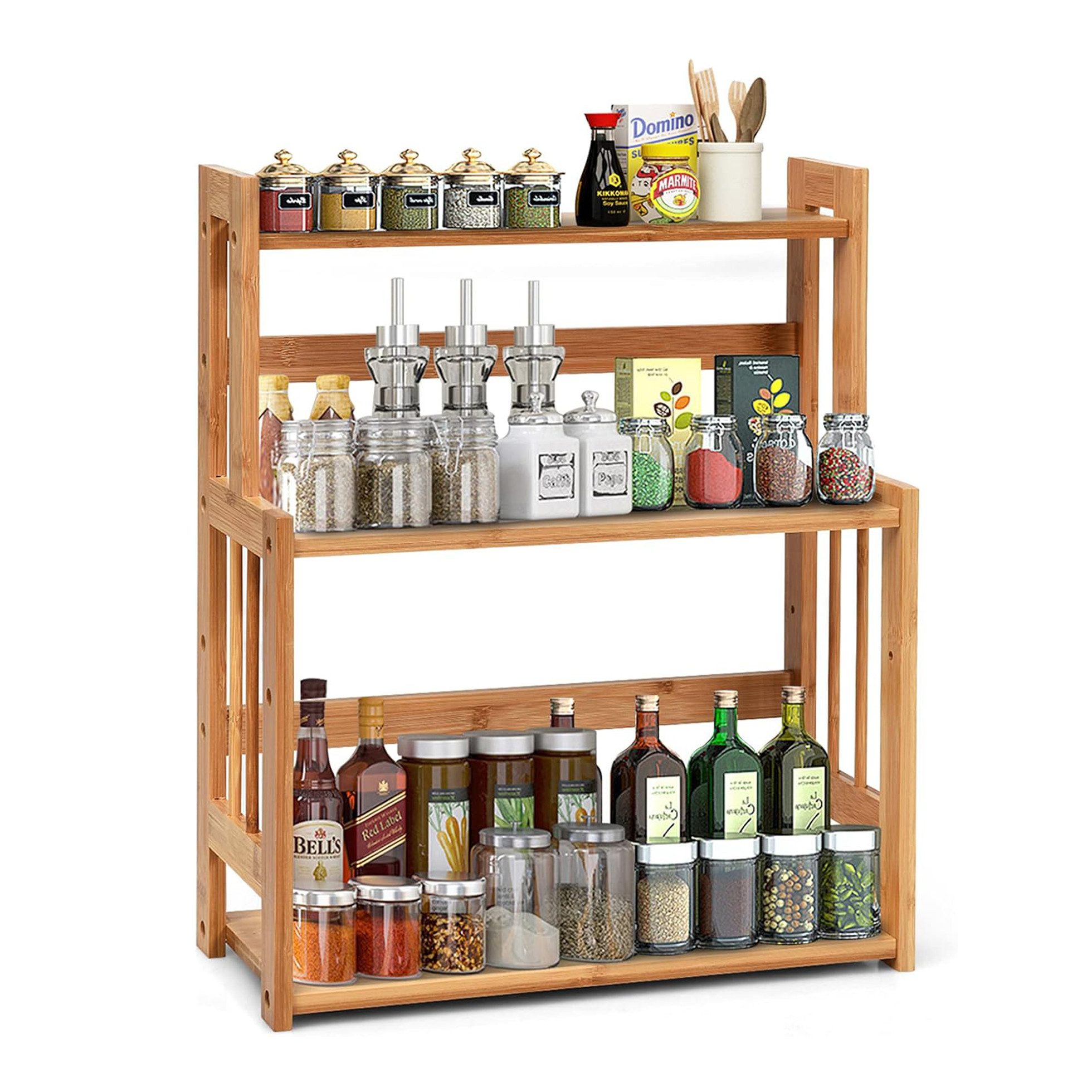 Mit dem Gewürzregal gewinnen Sie auf einen Schlag Übersicht in Ihrem Küchenschrank. Mit dem offenen Design sehen Sie sofort, wo jedes Gewürz steht und haben alles in der Griffnähe. Der Gewürzständer mit 3 Etagen und einer verstellbaren Ablage bietet Ihnen genügend und vielseitigen Platz und ist somit ideal zum Aufbewahren von Gewürzen, Kräutern und weitere Kleinutensilien. Dieses praktische Gewürzregal ist aus Bambus gefertigt und ist somit umweltfreundlich und gesund für den menschlichen Körper. Für zusätzlichen Stauraum-das schlichte gestaltete Gewürzregal von KOMFOTT.