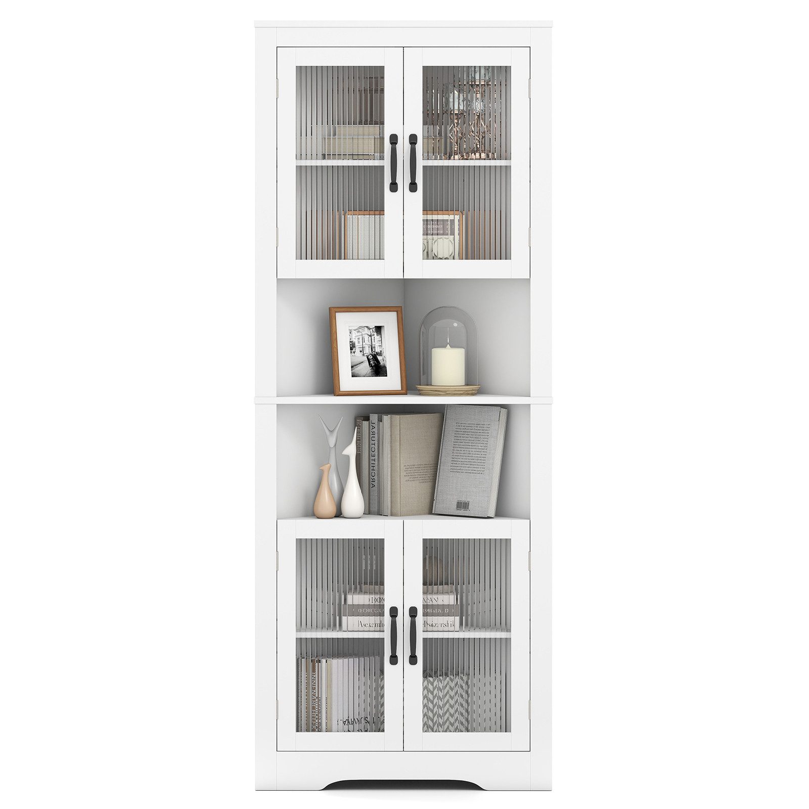 Verabschieden Sie sich von Unordnung mit unserem vielseitigen Eckaufbewahrungsschrank! Der Eckschrank passt perfekt in die Ecke eines jeden Raumes. Sie können ihn im Wohnzimmer, Schlafzimmer, Badezimmer, Esszimmer und mehr platzieren. 2 offene Regale und 2 geschlossene Schränke bieten reichlich Stauraum für Taschentücher, Bücher, Dekorationen, Geschirr, Bilderrahmen und mehr. 4 geriffelte Glastüren bringen nicht nur ästhetischen Reiz, sondern schützen auch die inneren Gegenstände. Darüber hinaus machen 2 verstellbare Regale ihn ideal für Gegenstände unterschiedlicher Höhen. Um ihn stabil zu halten, ist die Eckvitrine auch mit einer Anti-Kipp-Vorrichtung und einem stabilen Sockel ausgestattet. Türgriffe und Magnetverschlüsse sind ebenfalls vorhanden für bequemes Öffnen und Спрятать.