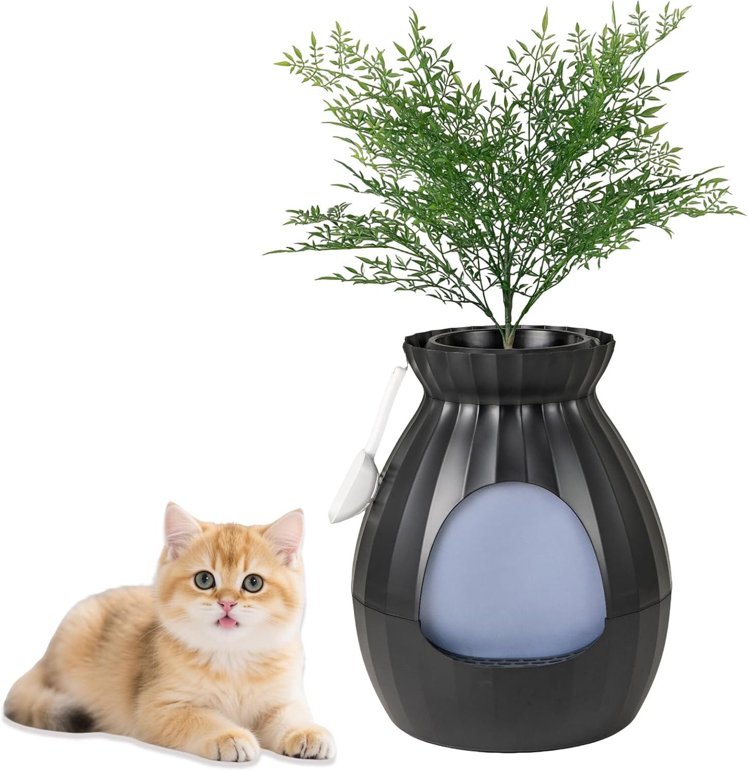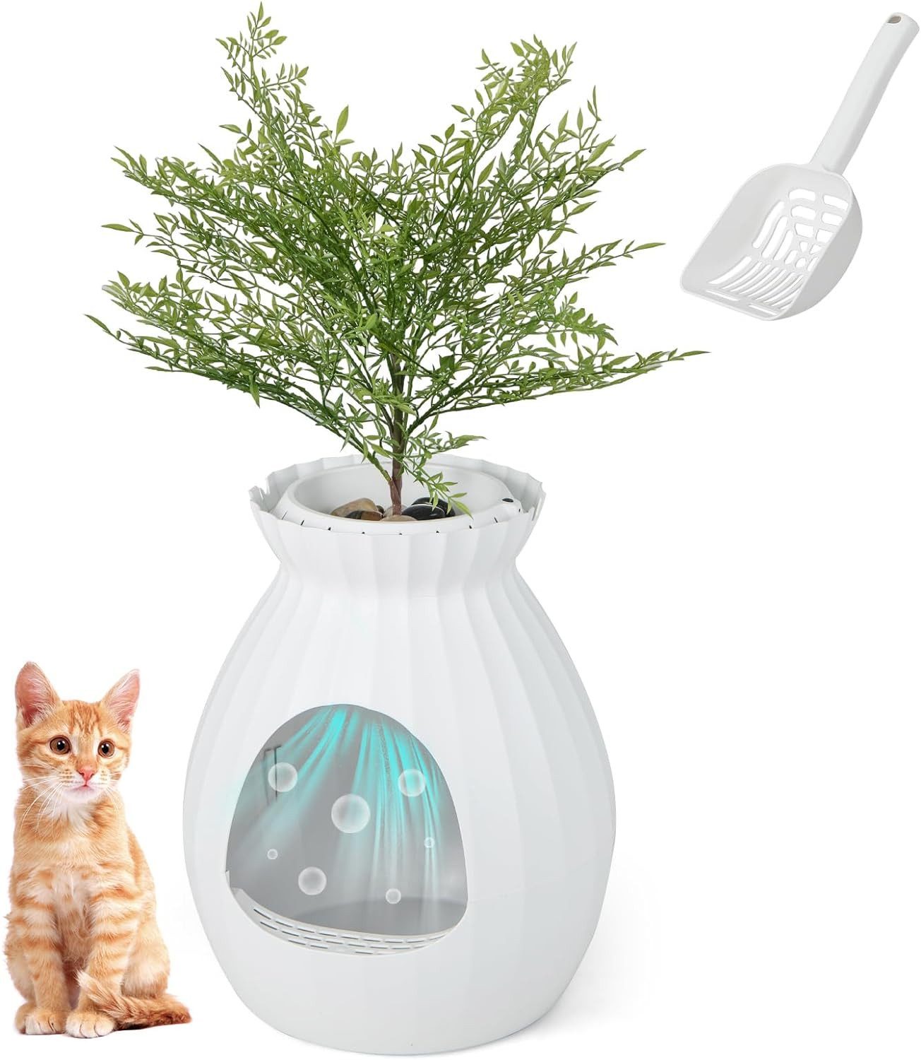 Das Design des Katzenklos und Pflanzenkombos bietet nicht nur eine diskrete und stilvolle Lösung für die Probleme mit der Katzentoilette, sondern auch eine ausgezeichnete Geruchskontrolle und Benutzerfreundlichkeit. Mit seiner einzigartigen Blumentopfform ist es nicht nur eine hervorragende Tarnung, sondern auch eine perfekte Wohnkultur. Zusammen mit einer künstlichen Pflanze und Kies verleiht es Ihrem Wohnbereich eine erfrischende Note. Darüber hinaus verfügt es über ein elektronisches Geruchsbeseitigungssystem, das effektiv reinigt und unangenehme Gerüche beseitigt. Das chemiefreie Design belastet zudem Ihre Haustiere nicht. Eine diskrete Privatsphäre für Ihre geliebte Katze wird durch den abnehmbaren Türvorhang geschaffen.