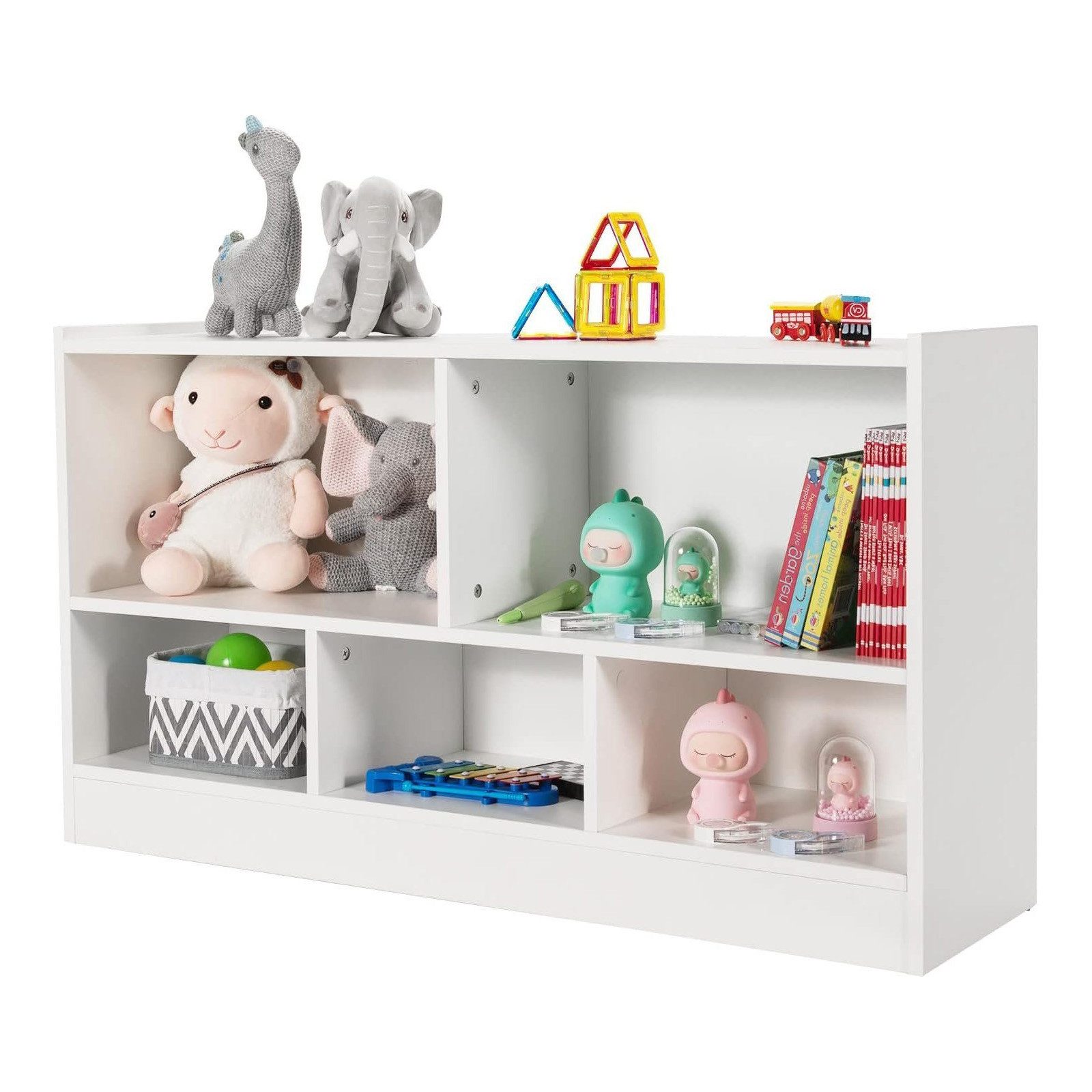 Dieses Kinderregal macht Ihre Kinder ihr Zimmer besser aufräumen. Es besteht aus hochwertigem Spanplatten als Ganzes, mit guter tragender, wasserdichter Oberfläche und einfacher Reinigung. Die Kunststoffschnalle und vier rutschfeste Fußpolster an der Unterseite machen das Kinderregal stabiler und fester. Gleichzeitig ist dieses Kinderregal in zwei Etagen unterteilt, mit fünf halboffenen Schließfächern, und Gegenstände sind auch auf der Oberseite platziert, was genügend Platz für Bücher, Spielzeuge, Puppen und so weiter bietet. Außerdem wird das runde Eckdesign an der Kante übernommen, um sicherzustellen, dass das Baby nicht zerkratzt wird. Die erhöhten Kanten verhindern, dass Gegenstände fallen und die erhöhte Unterseite vermeiden auch, dass Gegenstände durch das Wasser auf dem Boden nass werden. Und das weiße Aussehen und das modische Design machen dieses Regals auch zu einer schönen Dekoration für Kinderzimmer oder Kindergarten.