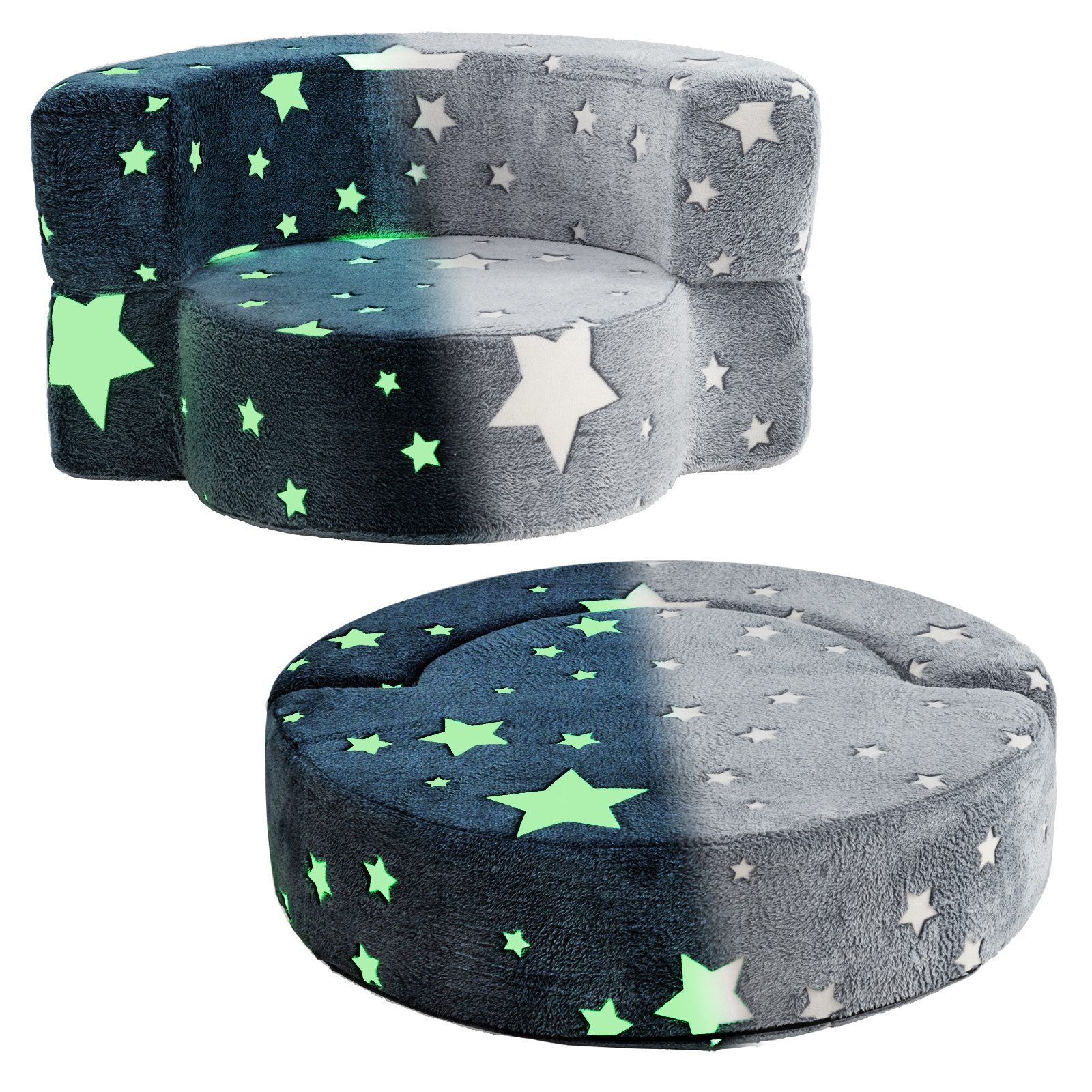 Nach nur 10 Minuten unter hellem Licht leuchtet das Sofa magisch im Dunkeln. Die kleinen grünen Sterne regen die Fantasie der Kinder an und erinnern an eine sternenklare Nacht! Das 2 in 1 umwandelbare Sofa kann ganz einfach von einem Sofa mit Rückenlehne in eine flache Spielmatte umgewandelt werden, um den verschiedenen Bedürfnissen der Kinder gerecht zu werden. Die weiche Schaumstoffpolsterung sorgt für optimalen Komfort. Wenn die Oberfläche verschmutzt ist, können Eltern den Bezug einfach abnehmen und in der Maschine waschen.