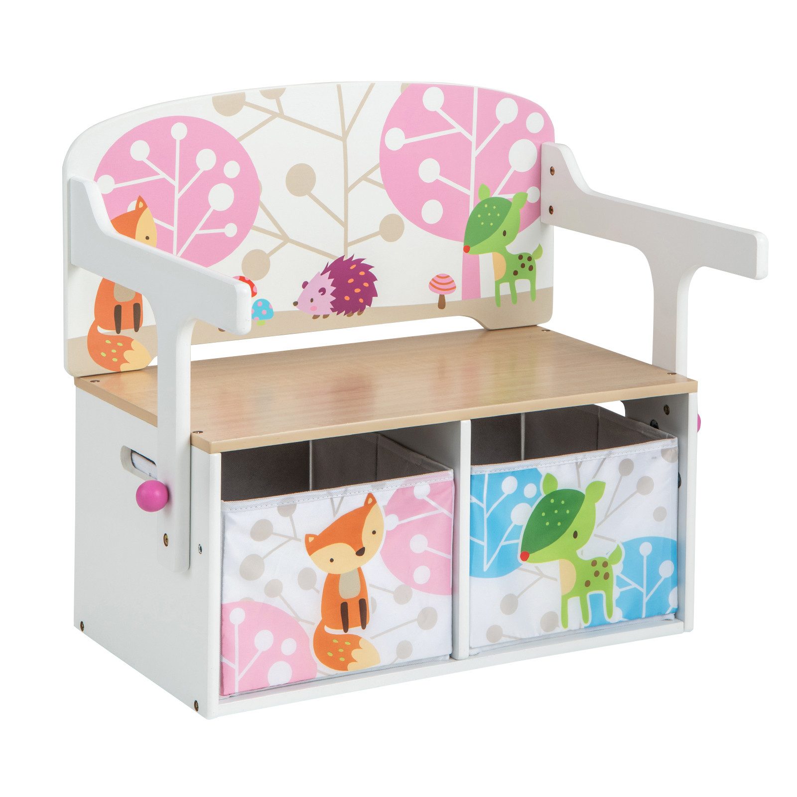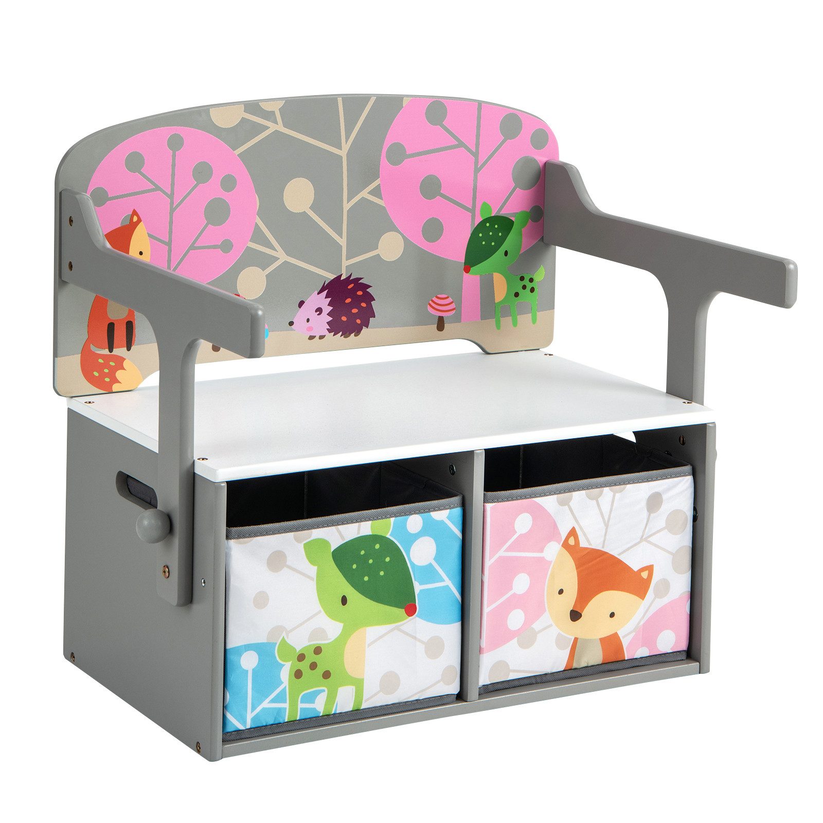 Die Kinderbank lässt sich frei in ein Schreibtisch- und Stuhlset umwandeln, ideal für Kinder zum Lernen, Zeichnen, Spielen und Essen. Zusätzlich bieten die ergonomische Rückenlehne und die Armlehnen den Kindern eine gemütliche Sitzerfahrung. Die 2 herausnehmbaren Stoffkörbe bieten außerdem viel Stauraum für die Sachen der Kleinkinder. Und die abgerundeten Ecken sind freundlich zur empfindlichen Haut der Kleinen. Das lebhafte Design spricht Kinder an und macht es zu einem perfekten Geschenk für das Spielzimmer, das Wohnzimmer oder den Kindergarten. Darüber hinaus erleichtert die glatte und wasserdichte Oberfläche die Reinigung.