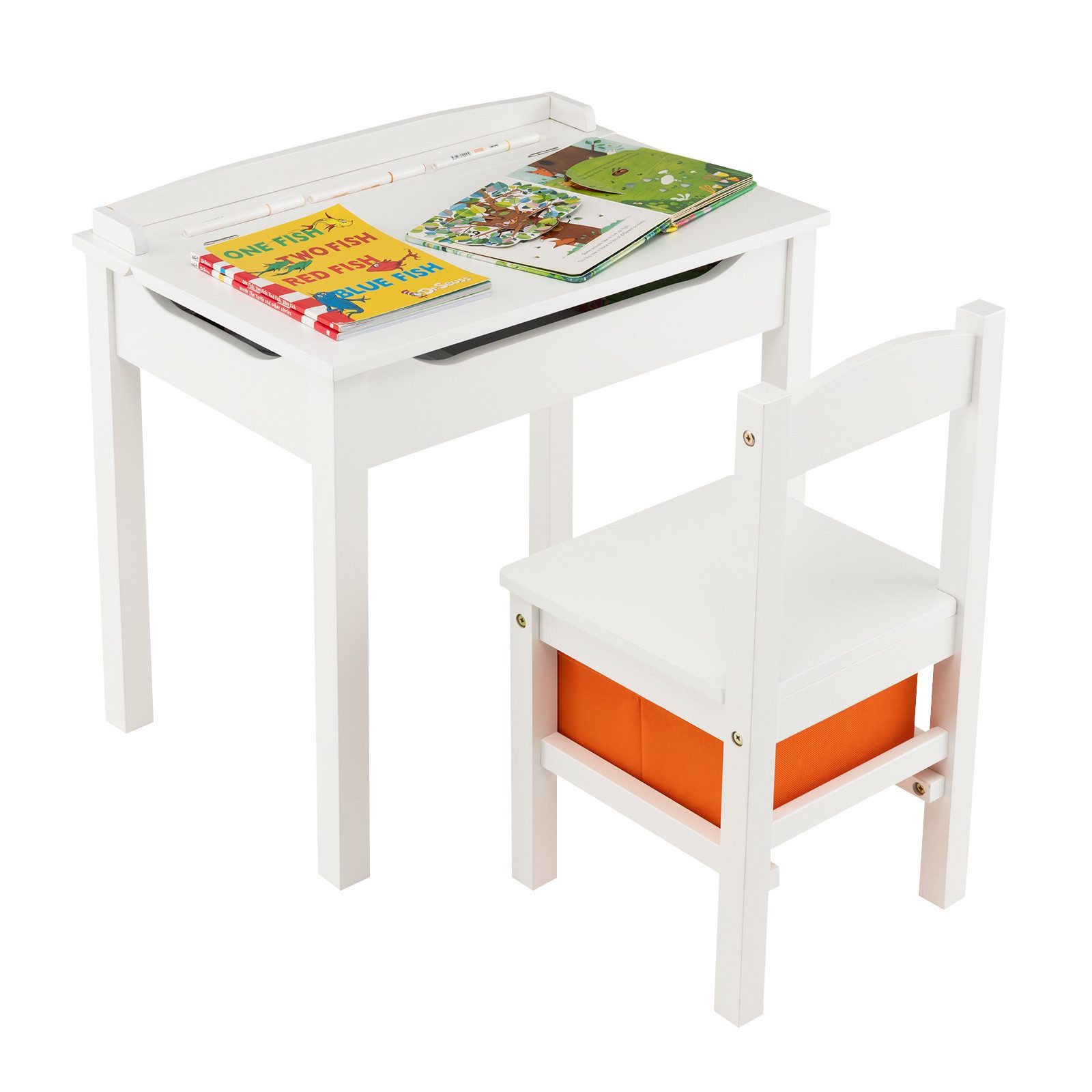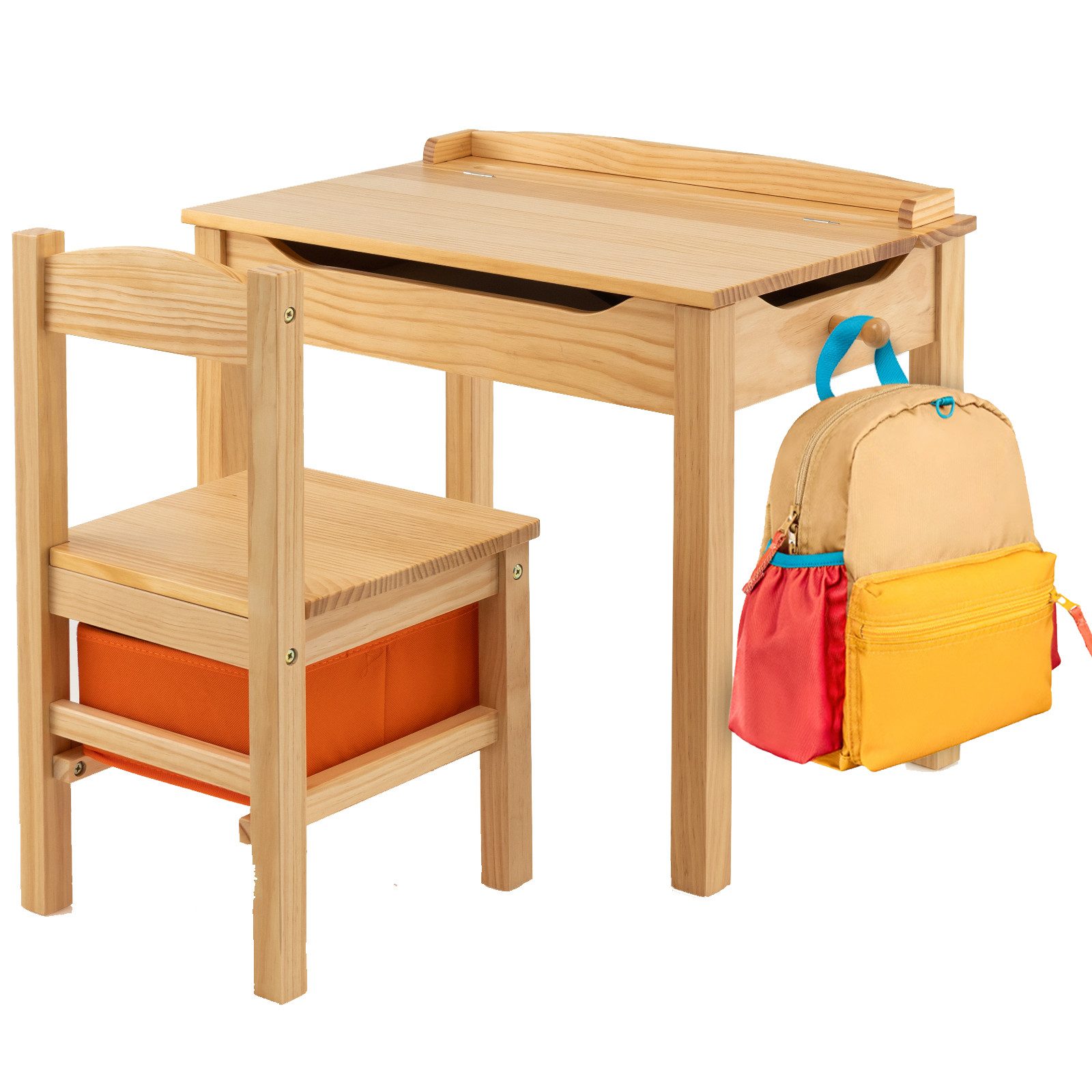 Mit dem aufklappbaren Design bietet der Schreibtisch viel Stauraum unter der Tischplatte, genug für häufig verwendete Schreibwaren, Bücher und andere wichtige Dinge. Ausgestattet mit einem langsam abfallenden Sicherheitsgelenk und einer Rille unter der Tischplatte müssen Eltern sich keine Sorgen machen, dass sich die Kinder beim Спрятать der Tischplatte verletzen. Der Stuhl ist auch mit einer Stoffschublade für Spielzeug, Bausteine usw. ausgestattet. Der Haken und der Stifthalter mit Anti-Fall-Brett bieten bequeme Aufbewahrungsmöglichkeiten. Dieses Kindertisch- und Stuhlset aus Massivholz und strapazierfähigem MDF zeichnet sich durch eine stabile Struktur aus und hält lange.