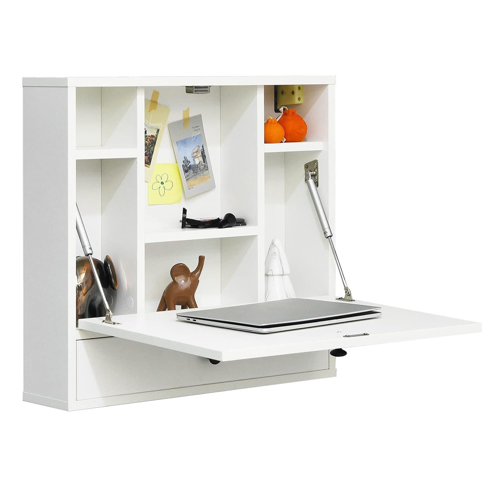 Der schwebende Schreibtisch mit praktischem Stauraum ist eine gute Wahl, wenn Sie von zu Hause aus arbeiten, aber keinen Platz für einen Stehschreibtisch haben. Er kann an der Wand montiert werden, um Platz zu sparen. Die Klapptischplatte kann nach Bedarf hoch- und heruntergeklappt werden. Gleichzeitig bietet er genügend Platz für einen Laptop, einige Bücher oder Ihre Kosmetik, um verschiedene Aktivitäten zu unterstützen. Zudem sind die unterstützenden pneumatischen Stäbe des Wandklapptisches glatt, leise und sicher in der Anwendung. Über der Tischplatte befinden sich 6 Aufbewahrungsfächern zur Präsentation und darunter eine breite Schublade mit bequemen Griff. All dies erleichtert Ihnen die Organisation Ihrer Arbeitsmaterialien.
