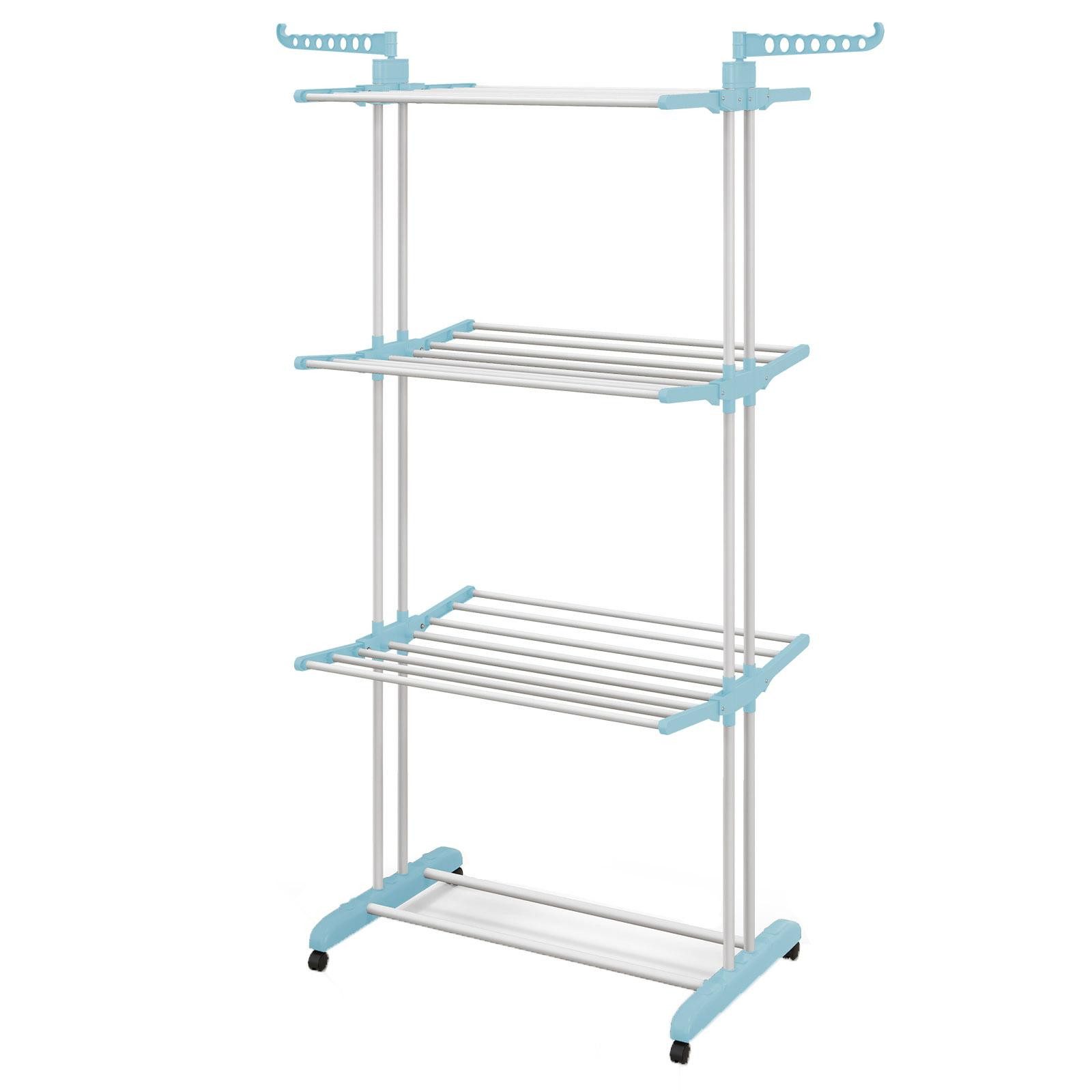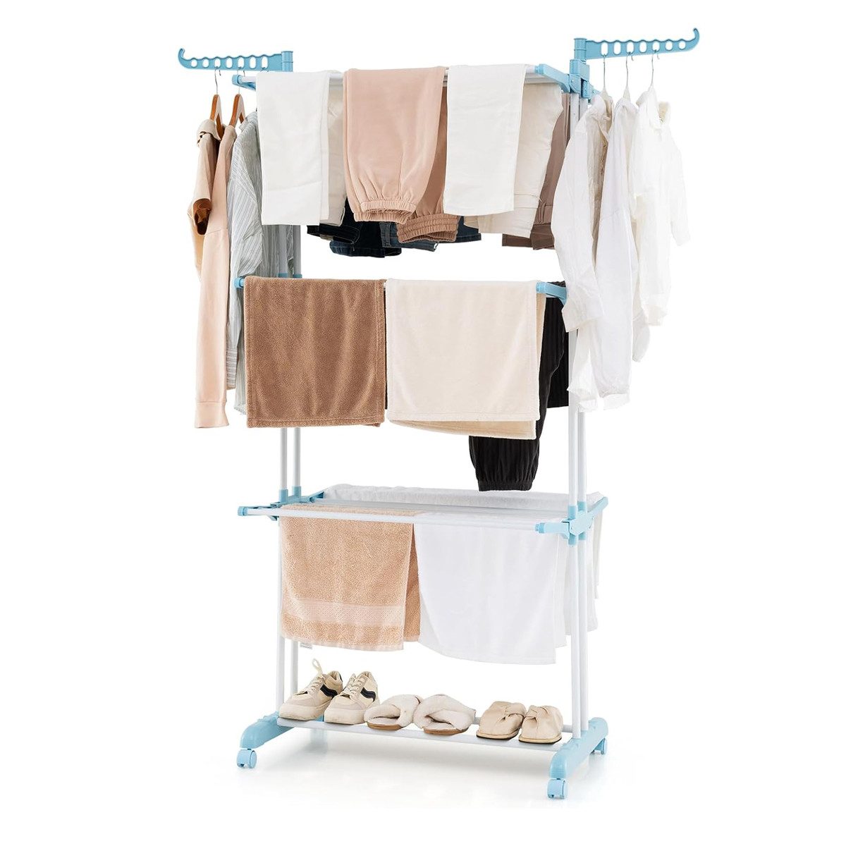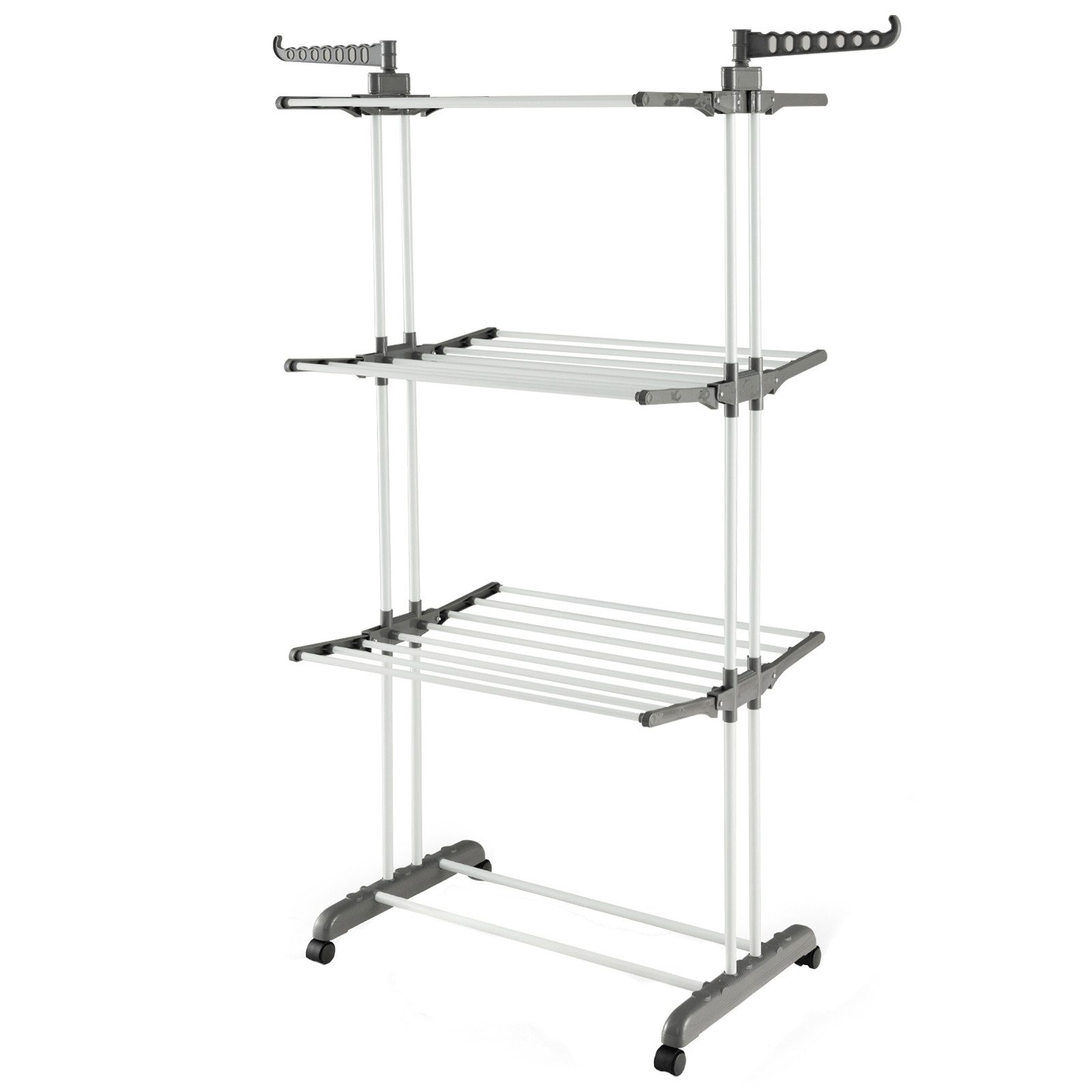 Unser Wäscheständer ist darauf ausgelegt, Ihren Wäschetag viel bequemer und stressfreier zu gestalten! Hängen Sie Ihre Wäsche auf die 3-stufigen Ablagen, die 2 seitlichen Flügel und das untere Schuhregal. Außerdem erleichtern die Rollen an der Basis den Transport der gesamten Wäsche an den Ort, an dem Sie mehr Sonnenlicht benötigen, ohne die Wäsche abladen zu müssen. Nach Gebrauch können Sie alle 6 seitlichen Ablagen zusammenklappen, um sie platzsparend zu verstauen, selbst in begrenztem Raum. Ein praktischer und stilvoller Kleiderständer zum Trocknen Ihrer Kleidung!