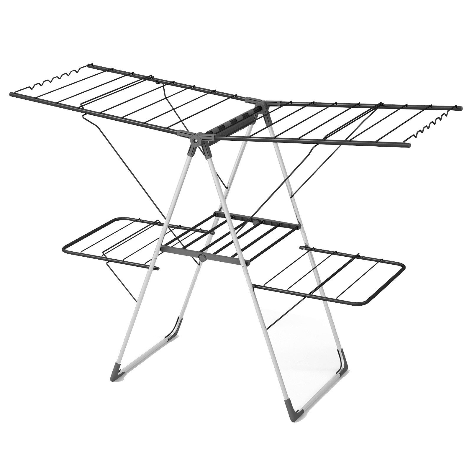 Maximieren Sie Ihren Platz zum Trocknen mit unserem verstellbaren Wäscheständer. Mit seinen 2 verstellbaren oberen Flügeln, 2 unteren Flügeln und einer kleinen Schuhablage kann er problemlos verschiedene Trockenanforderungen erfüllen. Die Trockenstangen sind im Abstand von 9 cm angeordnet, um eine optimale Luftzirkulation und ein schnelleres Trocknen zu gewährleisten. Der Trockenständer besteht aus einem robusten, pulverbeschichteten Metallrahmen, der eine lange Lebensdauer garantiert. Bei Nichtgebrauch lässt sich das Wäschegestell flach zusammenklappen und platzsparend verstauen. Dieser robuste und vielseitige Wäschetrockner ist ideal, um Ihre Wäsche effizient und ordentlich aufzubewahren.