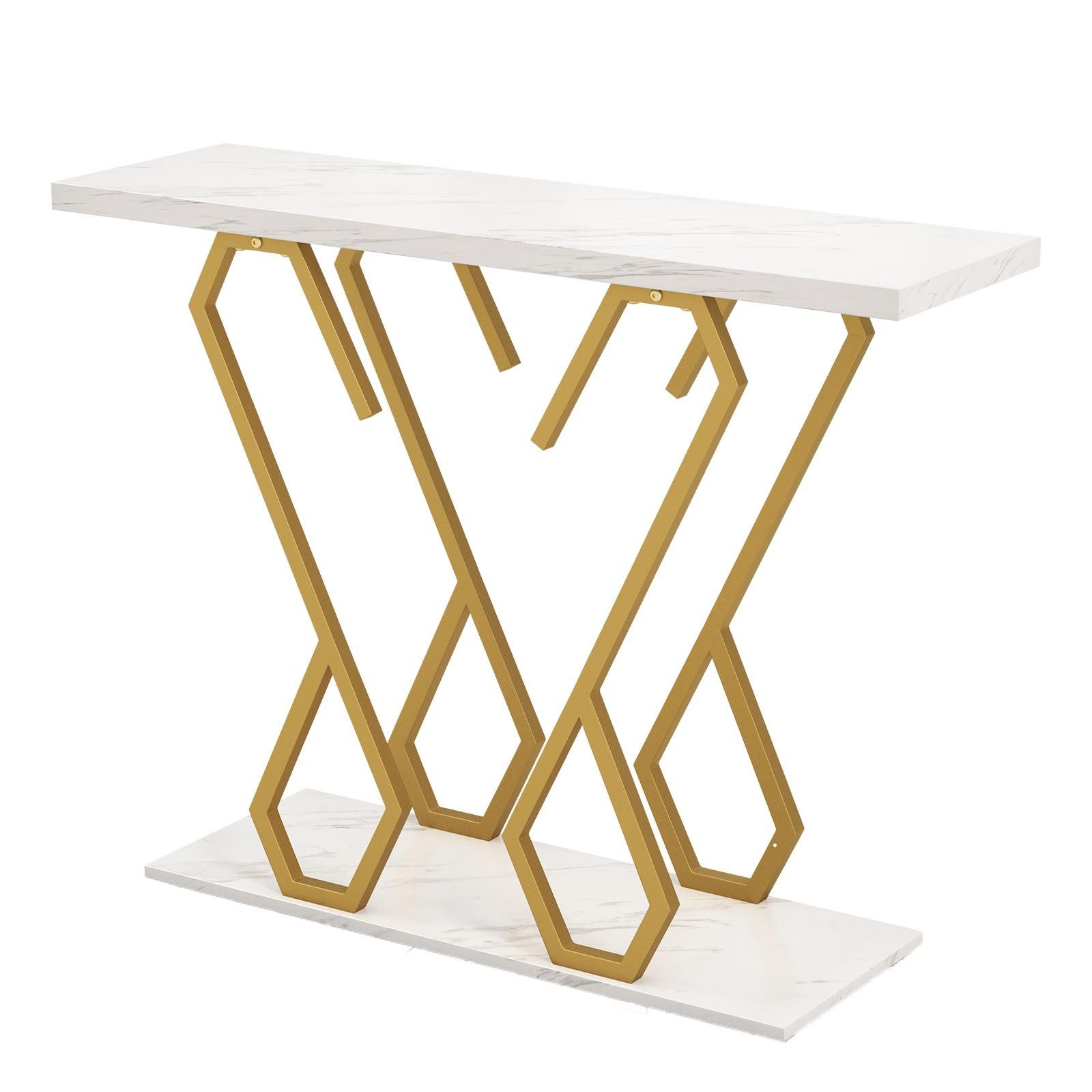 Verleihen Sie Ihrem Eingangsbereich einen Hauch von Eleganz mit unserem Marmorimitat-Konsolentisch. Sein modernes Design und die elegante Marmoroptik machen diesen Flurtisch zu einem Highlight in jedem Raum. Der Metallrahmen ist mit einer pulverbeschichteten Rostschutzschicht versehen, um eine langfristige Haltbarkeit zu gewährleisten. Mit 2 Ablagen bietet dieser Dielentisch praktischen Stauraum für die alltäglichen Gegenstände. Dank der Kippschutzvorrichtung lässt sich dieser Eingangstisch sicher an der Wand befestigen, und die verstellbaren Fußpads sorgen für mehr Standfestigkeit. Nicht nur optisch ansprechend, sondern erfüllt auch funktionale Ansprüche - ist unser schmaler Beistelltisch zweifellos die perfekte Ergänzung für jeden Flur, Eingangsbereich oder Wohnzimmer.