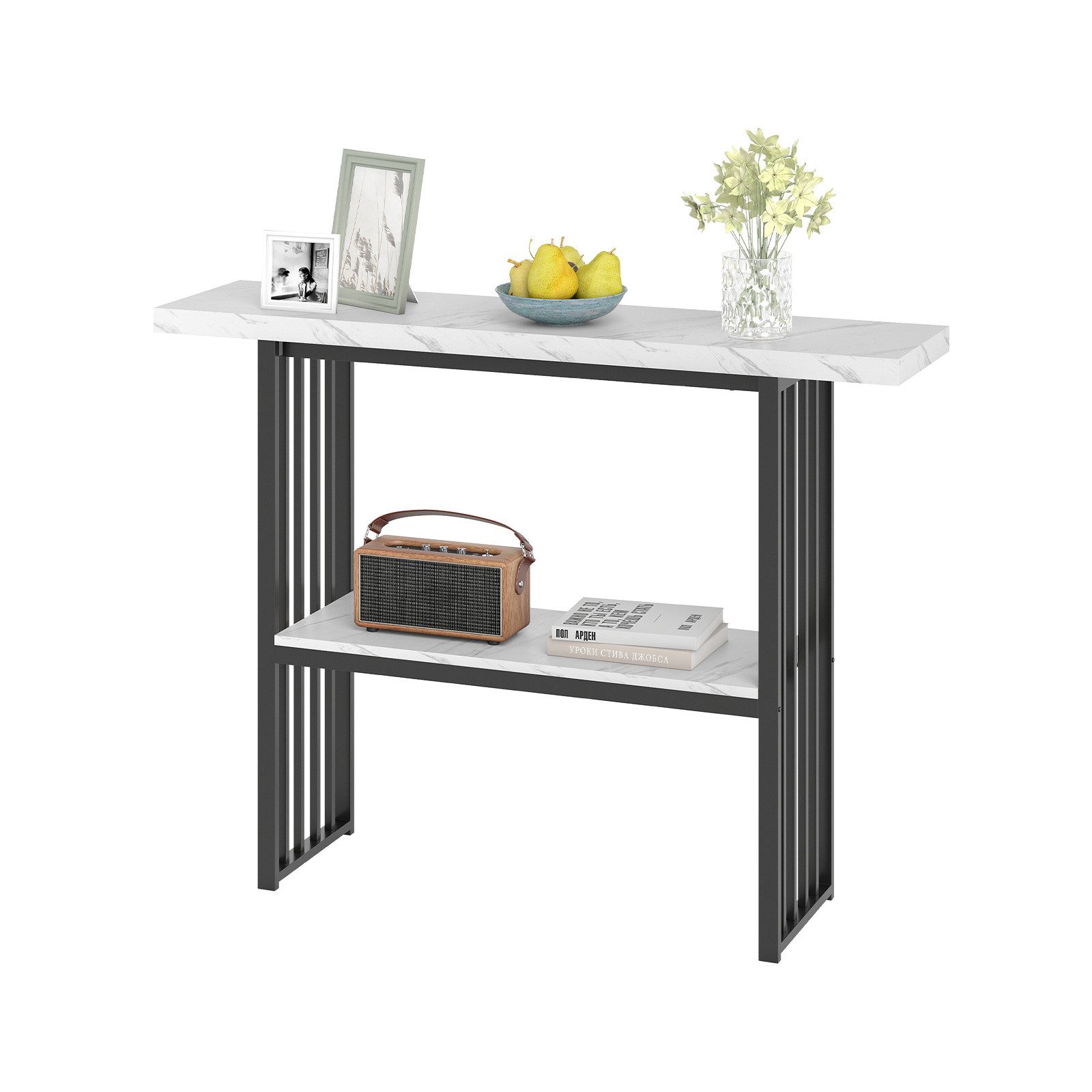 Verleihen Sie Ihrem Raum mit diesem schicken schmalen Konsolentisch einen frischen Look! Mit dem 2-stufigen Design bietet der Eingangstisch eine geräumige Tischplatte und ein zusätzliches Regal zur Aufbewahrung und Präsentation. Noch wichtiger ist, dass der schmale Beistelltisch nicht viel Platz einnimmt, was sich sehr gut für Wohnzimmer, Flur und Eingangsbereich eignet. Und der Sofatisch mit weißer Tischplatte aus Kunstmarmor und goldenem Gestell hat eine hochwertige Optik, die gut zu verschiedenen Inneneinrichtungen passt und sich auch hervorragend zur Dekoration des Raums eignet. Zudem ist das schicke Goldgestell aus pulverbeschichteten Stahlrohren langlebig und rostfrei. Und die mitgelieferten Anti-Kipp-Gurte funktionieren gut, um zu verhindern, dass der Tisch umkippt. Außerdem verlängert die 4 cm dicke Tischplatte die Lebensdauer.