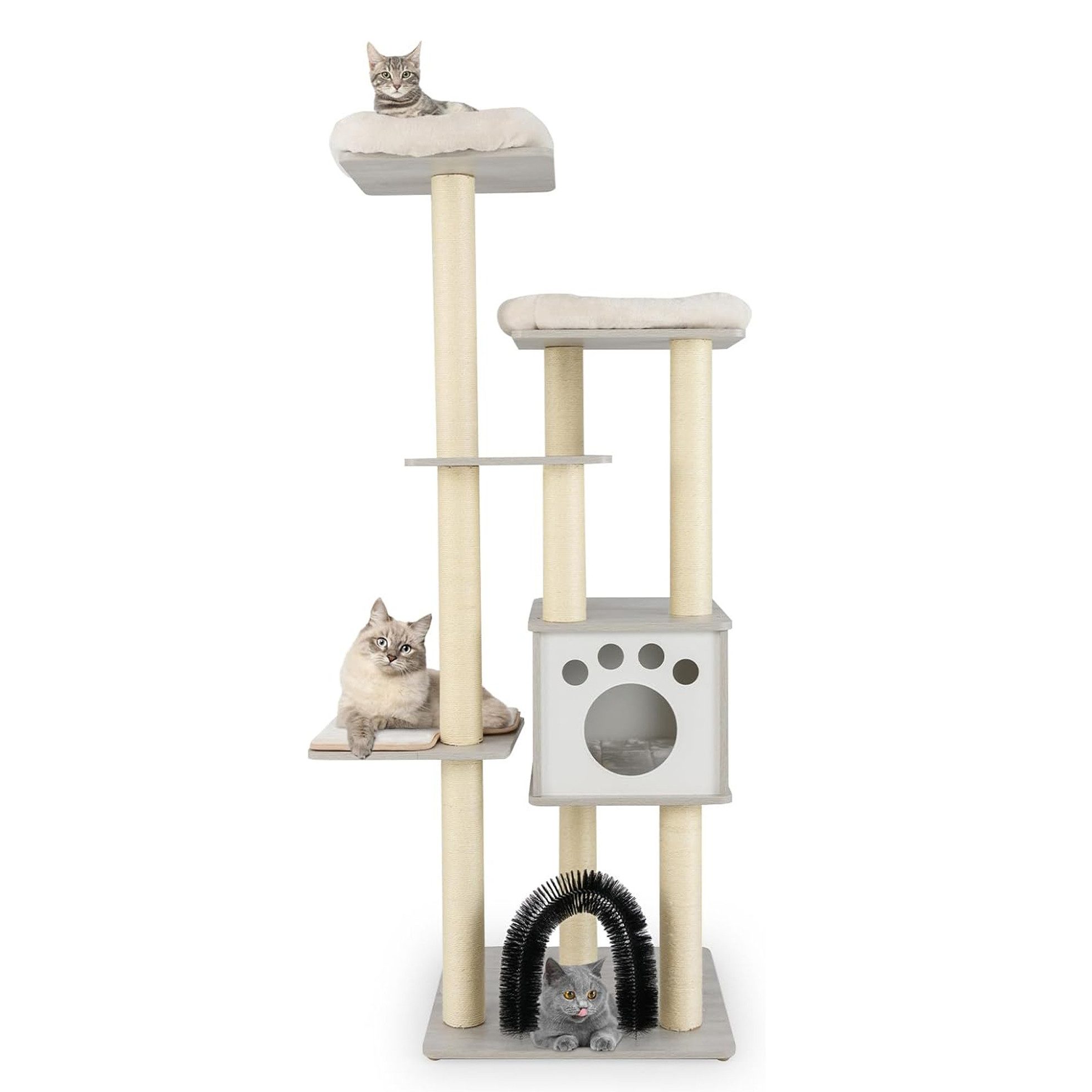 Mit 6 Sprungplattformen bietet dieser Katzenkratzbaum Ihrer Katze viel Platz zum Erkunden, Spielen und Trainieren. Ein privates Katzenhaus mit doppelseitigen Seitentüren ermöglicht es Ihrem fälligen Begleiter, bequem zu ruhen und zu entspannen. Darüber hinaus ist die Liegefläche mit weichen Kissen ausgestattet, um Ihrer Katze maximalen Komfort beim Liegen zu bieten. Darüber hinaus bieten Kratzbäume aus natürlichem Sisal eine dauerhafte Oberfläche für den Kratzinstinkt Ihrer Katze, während Borstenbürsten für ein anregendes Massageerlebnis sorgen. Mit unserem Katzenaktivitätsbaum wird Ihre Katze stundenlang unterhalten und entspannt!