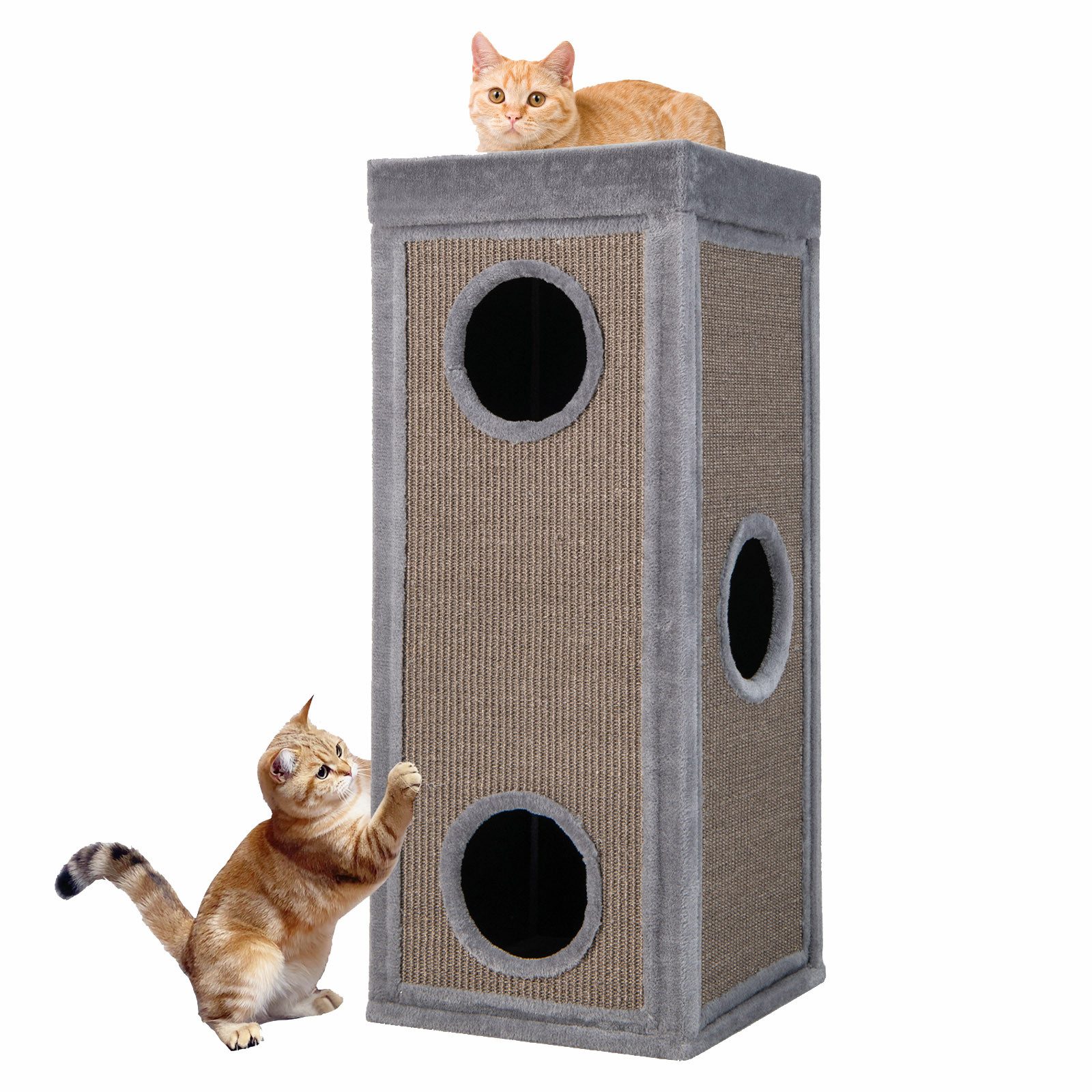 Der 4-Ebenen-Katzenturm kombiniert 3 halbgeschlossene Höhlen, die Schutz bieten, und eine gepolsterte obere Schlafplattform. Darüber hinaus integriert er 2 natürliche Sisal-Paneele, die das Kratzen umleiten und so Ihre Möbel schützen. Sein ultra-weicher Plüschüberzug bietet thermischen Komfort, während das abnehmbare Kissen häufige Wäschen erleichtert. Dank seiner 3 runden Eingänge und 2 inneren Löcher stimuliert er Kletterspiele und dynamisches Spiel. Schließlich integriert sein kompaktes Design maximale Funktionalität in minimaler Grundfläche, ideal für Ecken von Wohnzimmern oder Schlafzimmern.