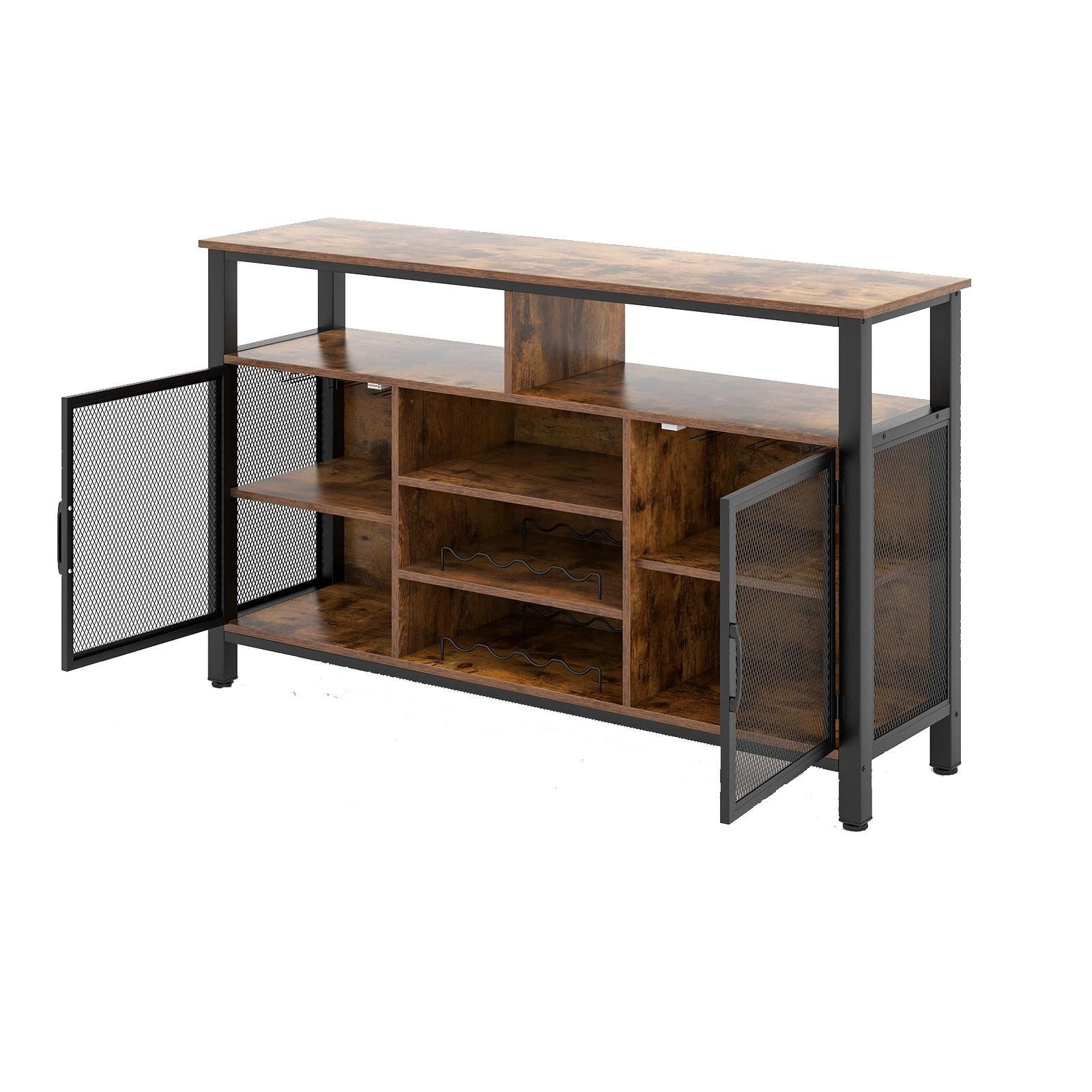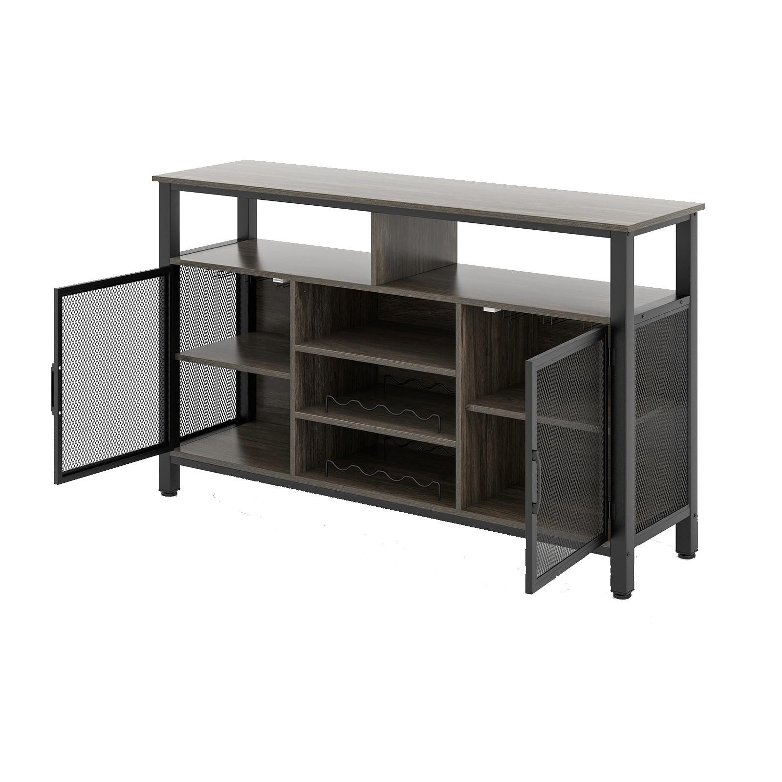Beschreibung: Egal, ob Sie ein Weinenthusiast sind oder gerne Gäste bewirten, dieser Spirituosenschrank ist es wert, ausprobiert zu werden! Der industrielle Weinschrank verfügt über Weinregale und Glashalter, um Ihre Sammlung stilvoll zu organisieren und zu präsentieren. Darüber hinaus bieten die obere Ablage, die offenen Regale und die 2 Schränke partitionierten Platz für Gegenstände. Die Tischplatte ist geräumig genug, um Flachbildfernseher bis zu 60" zu beherbergen und Ihnen ein visuelles Fest für stundenlanges Anschauen zu bieten. Darüber hinaus können 2 Anti-Umkippsysteme den Schrank sicher an der Wand befestigen, um ein Umkippen zu verhindern. Der Buffetschrank ist eine praktische und großartige Ergänzung für Zuhause und Bar.