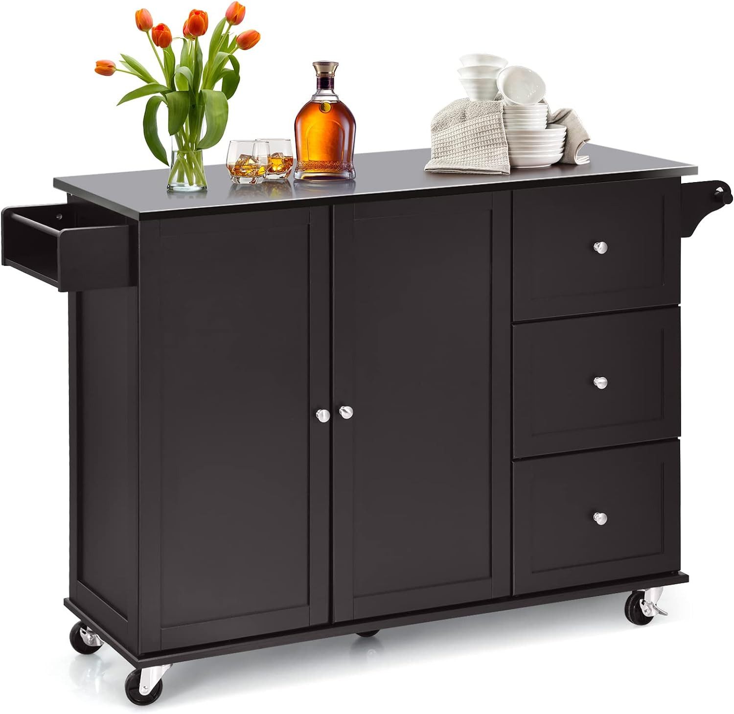 Wenn Sie auf der Suche nach einem vielseitigen Küchenwagen sind, sollten Sie sich unser Produkt nicht entgehen lassen. Der Essenswagen ist aus lackiertem MDF und Holzwerkstoffen gefertigt, die glatt und strapazierfähig sind. Die Platte besteht aus Edelstahl und ist wasser- und rostbeständig. Höhenverstellbare Trennwände ermöglichen es Ihnen, unterschiedlich große Gegenstände unterzubringen und den Raum sauber zu halten. Die Universalräder Design verleihen ihm das Aussehen einer Kücheninsel und den Komfort eines Küchenwagens. Außerdem sorgen drei Schubladen, ein Schrank, Handtuchhalter und ein Gewürzregal für zusätzlichen Komfort. Es ist die ideale Ergänzung für Küchen, Schlafzimmer, Esszimmer und vieles mehr.