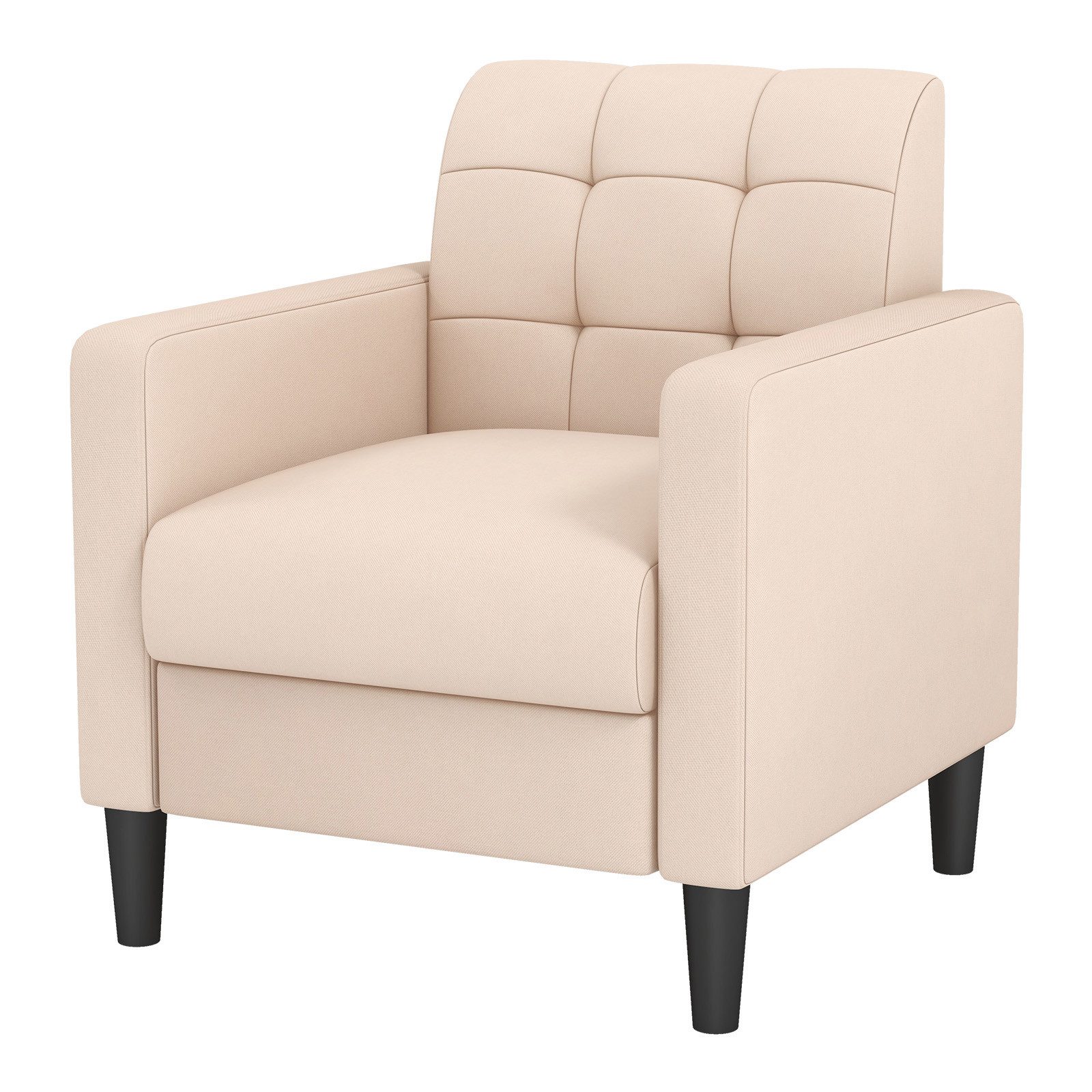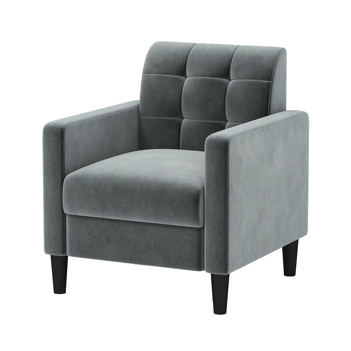 Mit weichem Samt bezogen und mit Knopfheftung verziert, verleiht dieser Akzentsessel jedem Raum Eleganz und Charme. Die dick gepolsterte Sitzfläche und die seitlichen Armlehnen bieten höchsten Komfort und laden Sie zu langen, entspannenden Lesestunden oder einfach zum Entspannen nach einem anstrengenden Tag ein. Sein Massivholzrahmen sorgt für Langlebigkeit und bietet eine robuste Stütze für bis zu 125 kg. Dieser vielseitige und stilvolle Einzelsessel eignet sich wunderbar als Lesesessel, Akzentstück oder zusätzliche Sitzgelegenheit in Ihrem Heimbüro, Wohnzimmer oder Schlafzimmer.