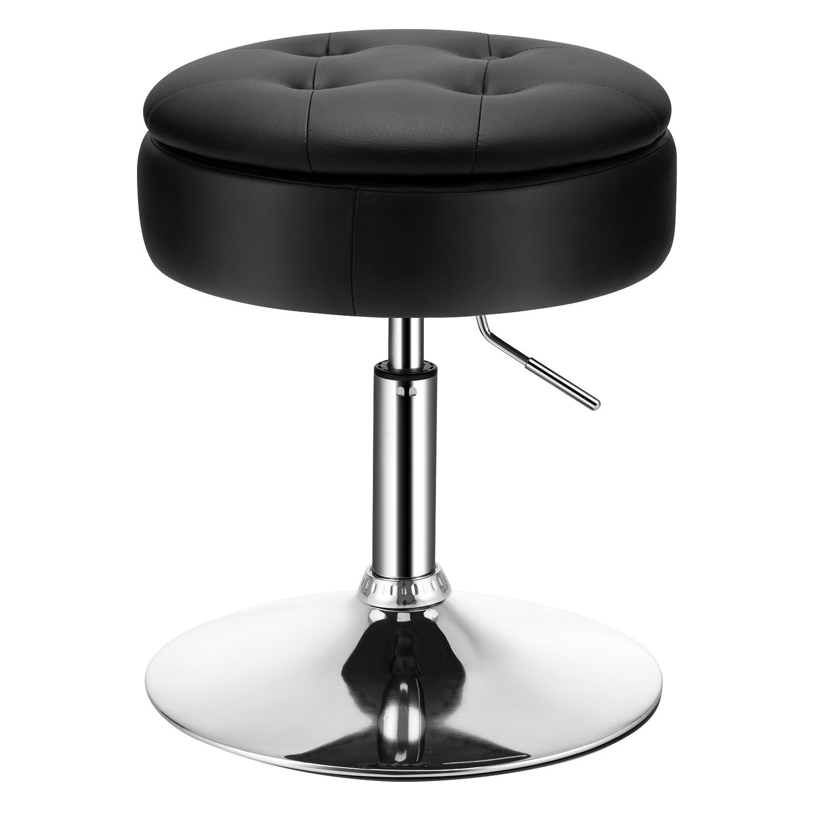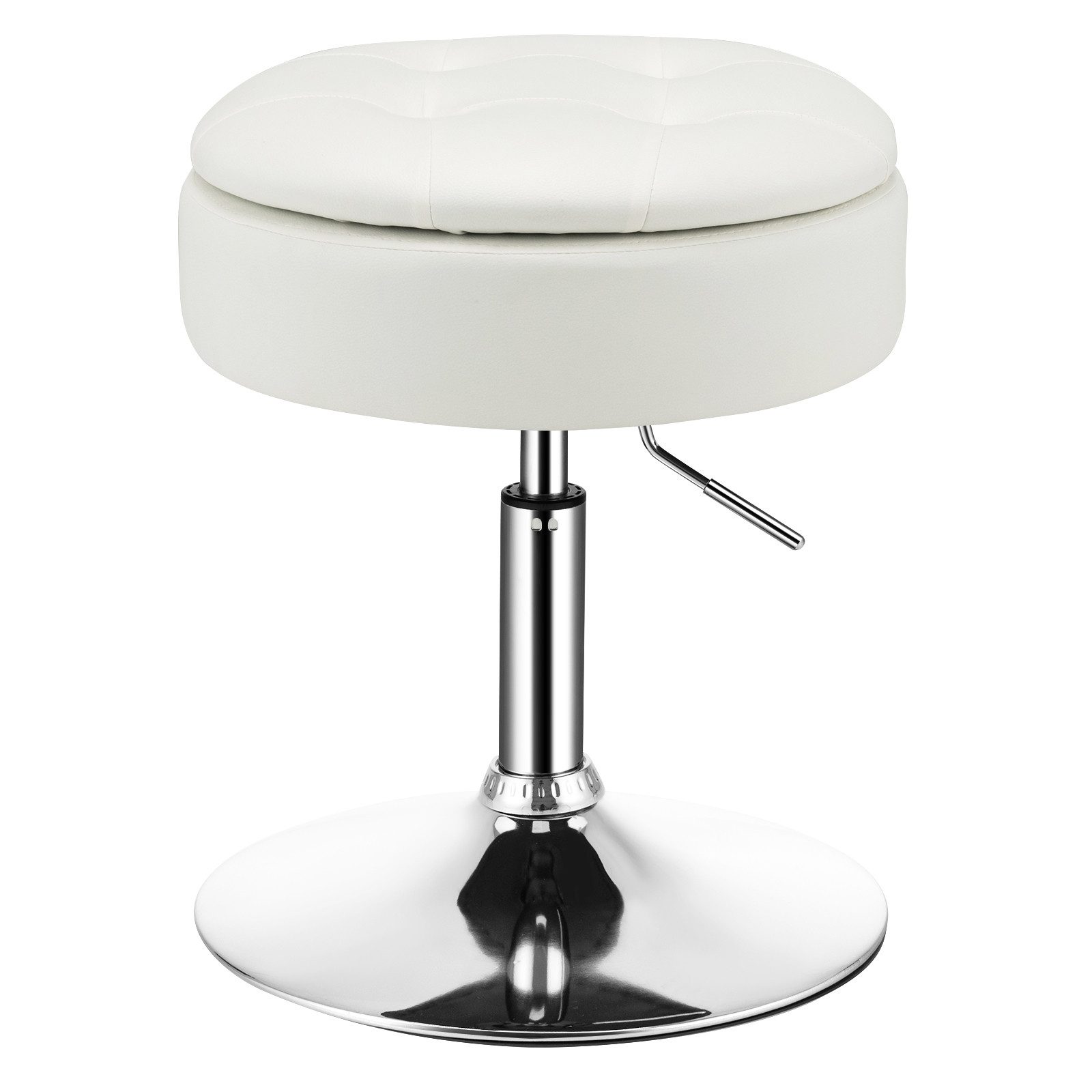 Möchten Sie einen Schminkhocker, der sowohl modernes Design als auch gute Praktikabilität bewahrt? Probieren Sie unseren Hocker! Dank der verstärkten Stahlbasis, die mit dem rutschfesten Gummiring ausgestattet ist, hält der Schminkhocker einem großen Gewicht von bis zu 150 kg stand. Darüber hinaus sorgen der innere Schwamm und das äußere Kunstleder für einen weichen Griff und eine gute Atmungsaktivität für Komfort. Wenn dich dein begrenzter Platz stört, kann er dir sehr helfen. Wenn Sie den oberen Deckel entfernen, finden Sie einen versteckten Stauraum, in dem Sie kleine Gegenstände ablegen können. Drehen Sie auch den Deckel um, der Schminkhocker kann auch als Couchtisch fungieren. Um sich Ihrer Körpergröße anzupassen, ist die Gesamthöhe von 51 cm bis 66 cm verstellbar, während der Sitz um 360° drehbar ist, um Flexibilität beim geschäftigen Schminken oder im Gespräch mit anderen zu bieten. Insgesamt ist er eine praktische Wahl im Wohnzimmer, Schlafzimmer, Eingangsbereich und so weiter.