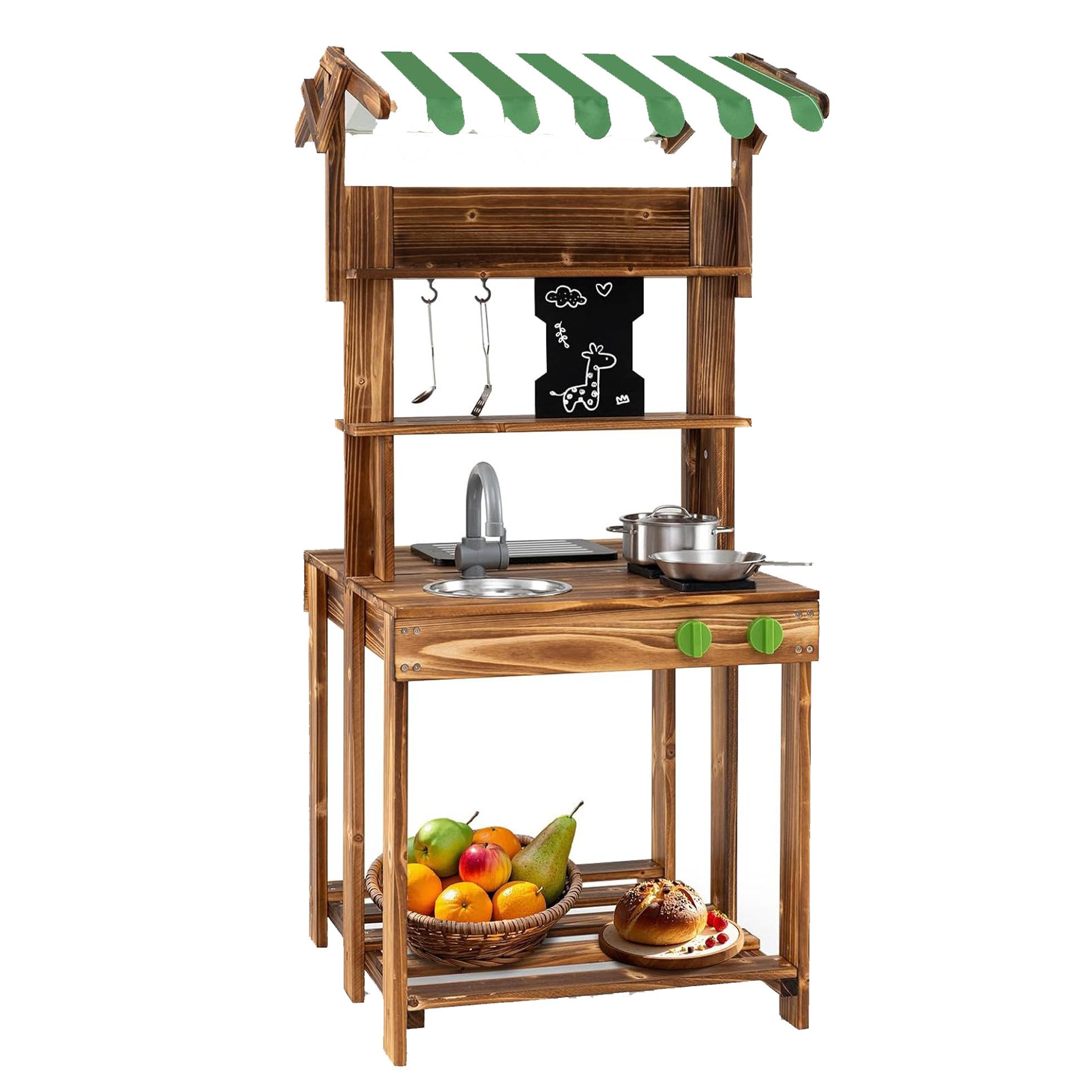 Diese doppelseitige Kinderküche ist darauf ausgelegt, die Fantasie und kulinarischen Fähigkeiten kleiner Köche zu fördern! Hergestellt aus sicherem, robustem Kiefernholz, bietet sie eine Seite zum Kochen und eine für das Grillen. Ausgestattet mit einer funktionalen Spüle, drehbaren Knöpfen und einer Schiebekreidetafel zum Zeichnen und Schreiben, ermöglicht diese Küche ein realistisches und gleichzeitig spaßiges Erlebnis. Mit zahlreichen Küchenutensilien und Stauraumoptionen wird das Aufräumen und Rollenspiel bei Kindern ab 3 Jahren gefördert.