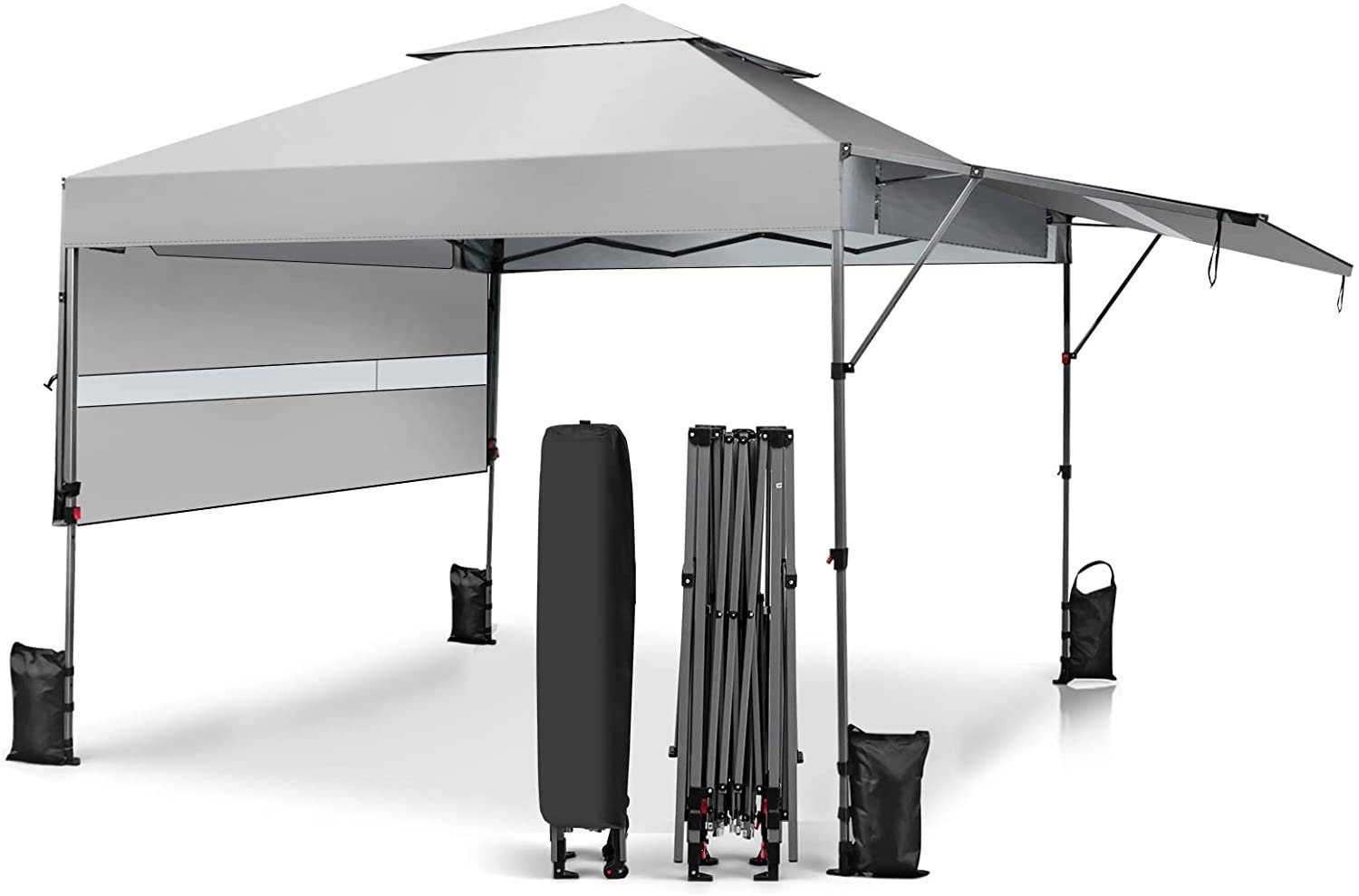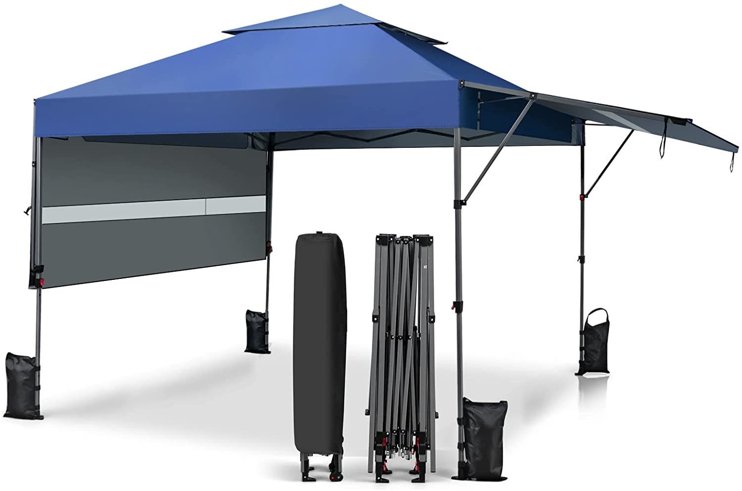 Dieser Pop-up-Pavillon mit zusätzlichen Sonnensegeln an beiden Seiten bietet Ihnen über 300 x 300 cm Schatten. Darüber hinaus lässt es sich in 3 Stufen in der Höhe verstellen, um allen Anforderungen gerecht zu werden. Die Markise besteht aus einem robusten Metallrahmen und hochwertigem Oxford-Gewebe, das eine lange Nutzungsdauer gewährleistet. Das Vordach ist stabil genug, um auch bei Wind und Regen zu bestehen.Vier Standfüße und zusätzliche Erdspieße, winddichte Seile und Sandsäcke sorgen für zusätzliche Stabilität. Zwei Standfüße mit Rädern ermöglichen eine einfache Bewegung. Erwähnenswert ist auch, dass der Pavillon nach dem Falten leicht in einer Aufbewahrungstasche verstaut werden kann.