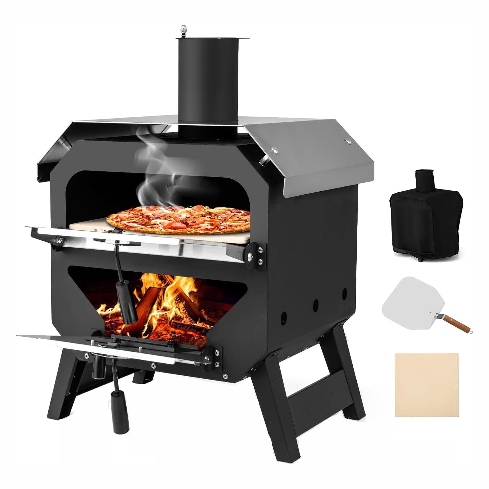 Dieser Pizzaofen verfügt über eine doppelte Kochkammer und eignet sich für die Zubereitung von Pizza, Steaks, Gemüse und anderen Köstlichkeiten. Der Pizzaofen wurde speziell für eine effiziente Wärmeverteilung entwickelt, die eine schnelle und gleichmäßige Erwärmung ermöglicht. Er ermöglicht ein schnelles Backen bei einer Temperatur von 510 °C in nur 1 bis 2 Minuten. Um eine sichere Verwendung zu gewährleisten, ist der Ofen mit einer wärmeisolierenden Edelstahlabdeckung und einem hitzebeständigen Griff ausgestattet. Darüber hinaus wird dieser tragbare Pizzaofen mit einer wasserdichten Oxford-Stoffabdeckung geliefert, die ihn wirksam vor Sonneneinstrahlung, Regen und Schnee schützt. Nach dem Essen lässt er sich über die hintere Ascheklappe und den abnehmbaren Rost leicht reinigen.