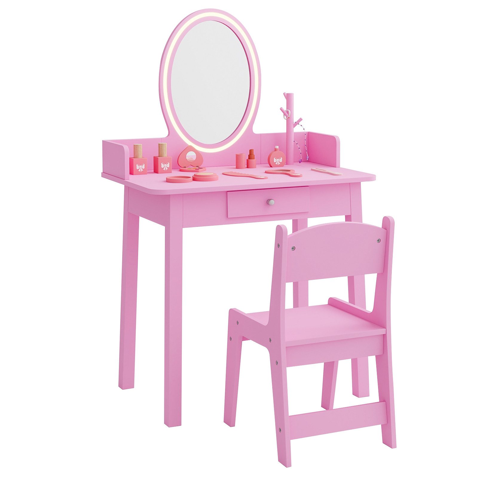 (мы ещё работаем над переводом, извините за неудобство): Wenn Sie das perfekte Schminktisch-Set für Ihre kleine Prinzessin suchen, sind Sie hier genau richtig! Der Schminktisch ist mit einem atemberaubenden beleuchteten Spiegel mit zweifarbiger LED-Beleuchtung ausgestattet, sodass Ihr Kind zwischen warmgelben und kaltweißen Beleuchtungsoptionen wählen kann. Und der Spiegel aus Acryl ist sicher und langlebig. Damit alles organisiert bleibt, ist der Schminktisch für Kinder mit einer geräumigen Schublade und einem baumförmigen Schmuck-Organizer ausgestattet. Darüber hinaus kann der an drei Seiten erhöhte Zaun auf dem Schreibtisch die Gegenstände der Kinder vor dem Herunterfallen schützen. Dieses Schminktisch-Set ist mit Beinen aus Massivholz gefertigt und zeichnet sich durch hohe Stabilität aus. Noch wichtiger ist, dass der Schminktisch im Hinblick auf die Sicherheit Ihres Kindes mit einer Kippschutzvorrichtung ausgestattet ist, um Unfälle zu verhindern.