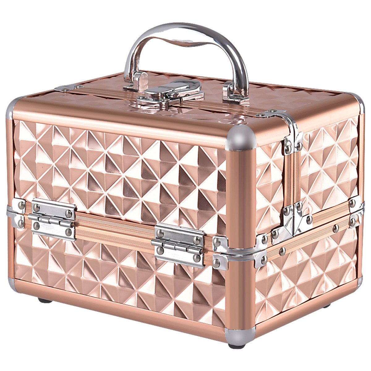 Der Kosmetik ist aus hochwertige Material gamacht , deswegen ist er Robust und langlebig. Die Oberfläche ist in schöner Muster und seine Strukur enthält geschwungen Metallecken, das moderne Design sieht sehr schön aus und ist auch praktisch. Innerhalb gibr es 2 ausziehbare Tabletts, deshalb kann er für Ihnen Großer Stauraum bieten, damit können Sie viele Kosmetika Schminkpinsel und andere Makeup-Werkzeuge geordenet stellen. Seine Размер ist aber klein, mit ihm können Sie auch leicht bewegen, beim Reise ist er auch geeigenet.