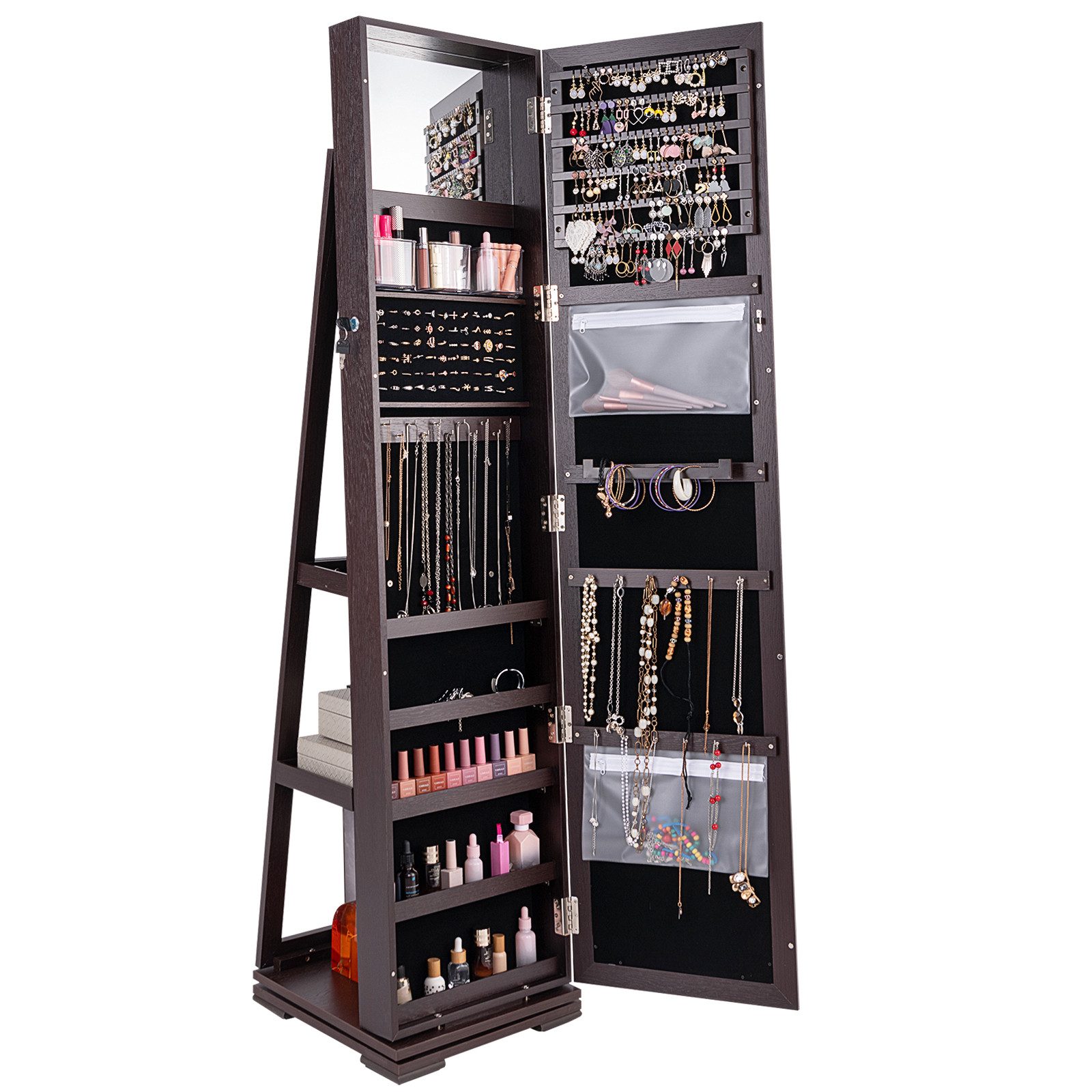 Der drehbare Schmuckschrank mit elegantem Aussehen ist eine praktische Ergänzung für Ihr Schlafzimmer und bringt Ihrem Zimmer gleichzeitig mehr Ordnung. Ein geräumiger Schrank, ein Ganzkörperspiegel und drei Schubladen bieten Ihnen vielseitigen Stauraum. Sie bewahren alles, was Sie benötigen, wie z. B. Ketten, Armbänder, Hängeohrringe, Ohrstecker, Ringe, Kosmetikartikel und Parfums. Mit Ganzkörperspiegel und dem eingebauten Schminkspiegel bewundern Sie Ihr wunderschönes Outfit und auch Ihr perfektes Make-up. Zudem kann man den Schrank abschließen, sodass Ihr Schmuck sicher vor den Kleinen geschützt.