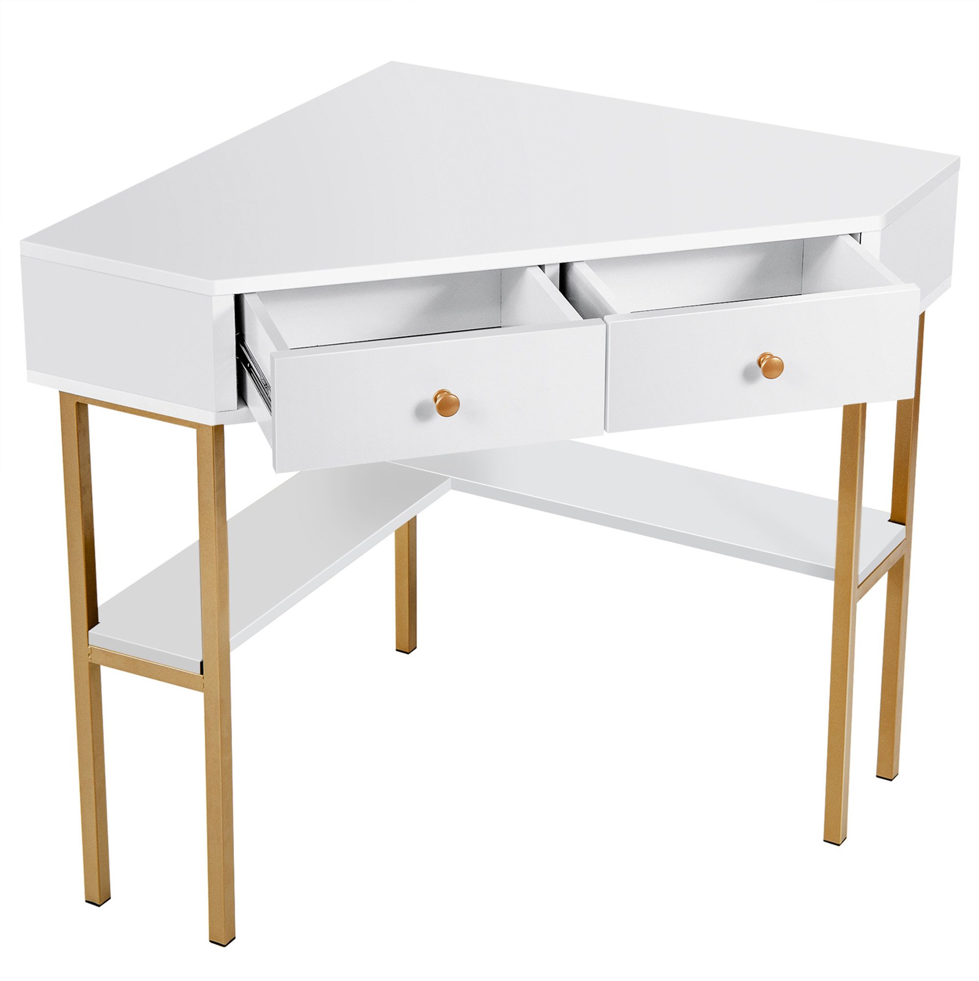 Dieser Eckschreibtisch besteht aus hochwertigem MDF und 5 starke Stahlbeine machen ihn zu einer stabilen und robusten Struktur. Dank seines einzigartigen dreieckigen Designs eignet sich dieser Tisch ideal zum Aufstellen in der Ecke eines kleinen Raums und ist ein großartiger Platzsparer. Er verfügt über eine große und geräumige Tischplatte, 2 Schubladen mit großem Fassungsvermögen und 2 offene Ablagefächer, die ausreichend Stauraum für alltägliche Gegenstände wie Computer, Lampen, Tassen, Schreibwaren, Bücher und mehr bieten. Aufgrund seines stilvollen Aussehens und seines kompakten Designs eignet sich dieser Ecktisch ideal als Schreibtisch, Computertisch, Büroisch und Schminktisch für Wohnzimmer, Schlafzimmer und Büro.