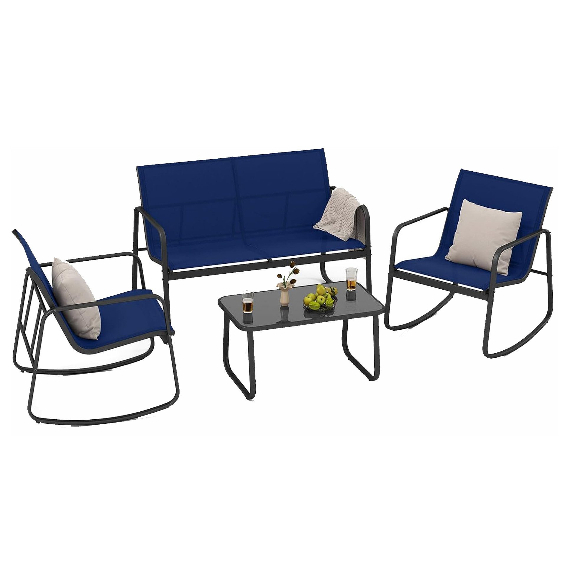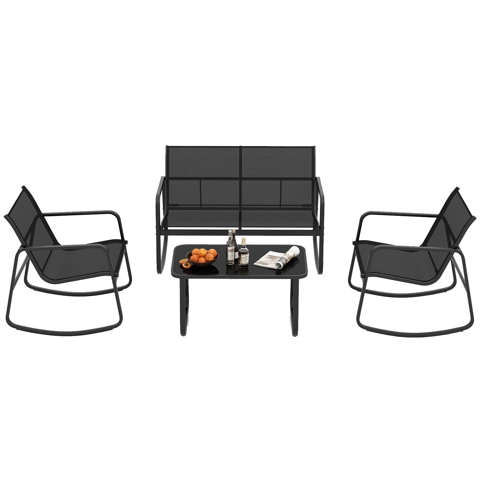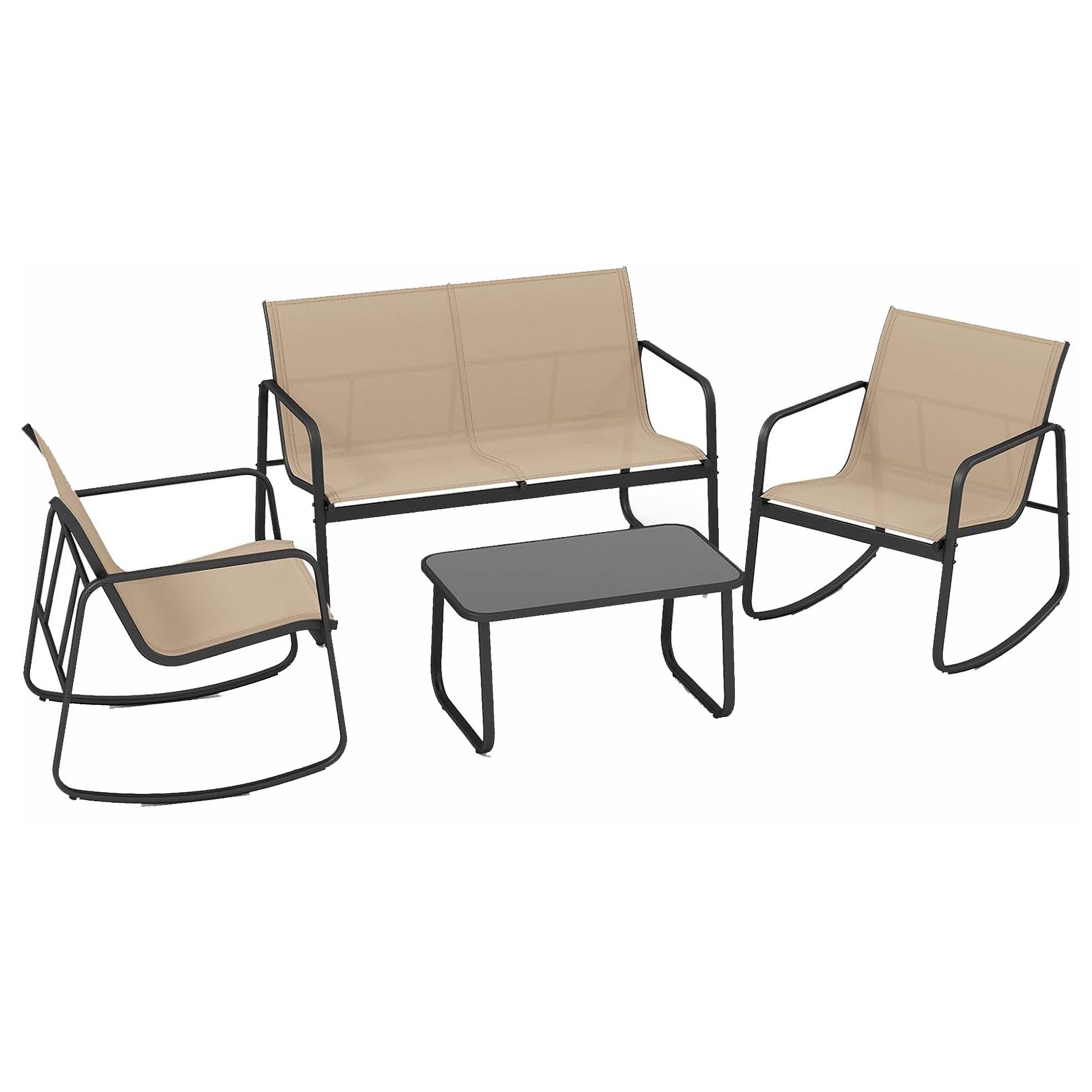 Beschreibung: Dieses 4-teilige Schaukel-Bistro-Set ist die perfekte Ergänzung für jeden Außenbereich! Dieses Outdoor-Gesprächsset umfasst 1 Zweisitzer, 2 Schaukelstühle und 1 Couchtisch mit Glasplatte und bietet eine bequeme und stilvolle Sitzgelegenheit. Die Schaukelstühle sind für maximalen Komfort konzipiert, mit ergonomischen Kurven und sanfter Schaukelbewegung. Das atmungsaktive Material ist wetterbeständig, schnell trocknend, farbecht und langlebig. Der Glastisch ist nicht nur funktional, sondern auch leicht zu reinigen. Ob Sie sich mit Freunden unterhalten, eine Tasse Kaffee genießen oder sich nach einem langen Tag einfach entspannen möchten, dieses 4-teilige Schaukel-Bistro-Set bietet die perfekte Umgebung.