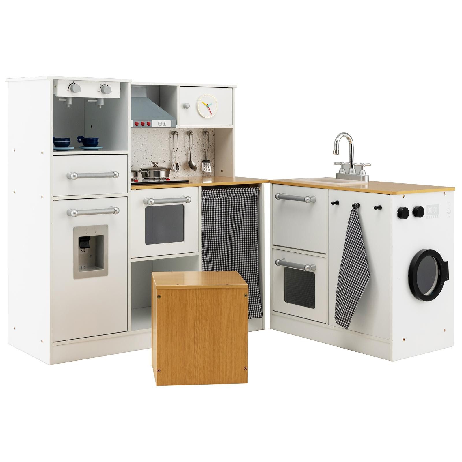 Dieses Küchenspielset umfasst einen Herd, eine Spielspüle, eine Waschmaschine, einen Wasserspender, eine Kaffeemaschine, einen Ofen, verschiedene Küchenaccessoires und verschiedene Kochutensilien, damit Ihr Kind unzählige Stunden Spaß und Spiel haben kann. Stellen Sie einen Topf oder eine Pfanne auf den Herd und schalten Sie ihn ein, der Herd leuchtet auf und gibt ein Geräusch von sich, das den echten Herd nachahmt. Zusätzlich kann der Hocker als praktisches Ablagefach genutzt werden. Mit dem multifunktionalen Kinderküchenset können Kinder ein interessantes Rollenspiel haben und ein großartiger Koch sein. Darüber hinaus werden die Kreativität und die praktischen Fähigkeiten der Kinder während des Spiels gesteigert.