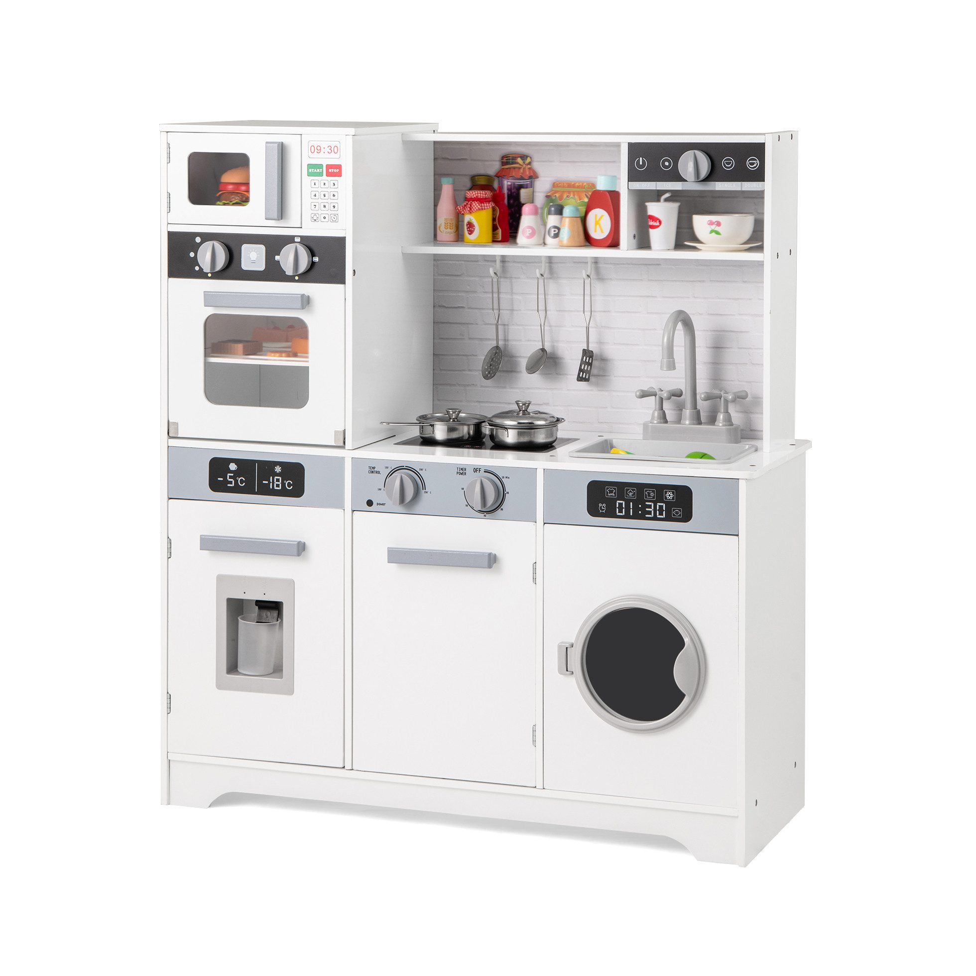Das Spielküchenset bietet interaktive Funktionen wie klickende Knöpfe, einen Wasserspender mit Lichtern, simulierte Herde, eine Spüle mit Wasserhahn und Türen, die sich sanft öffnen lassen, sodass Ihr Kind so tun kann, als würde es imaginäre Festmahle kochen, Geschirr spülen und Wäsche waschen. Das mit einer Waschmaschine, einer Kaffeemaschine, einem Ofen, einem Kühlschrank und einer Mikrowelle ausgestattete Küchenspielzeugset fördert die Eltern-Kind-Interaktion und die sozialen Fähigkeiten. Außerdem enthält das Set realistische Kochzubehörteile wie Utensilien, Töpfe und Pfannen, die das Spielerlebnis verbessern. Die Spielküche mit seinen vielen Schränken, Fächern und Haken verfügt über ausreichend Stauraum für Teller, Spielzeuge, Snacks, Tassen und Schürzen.