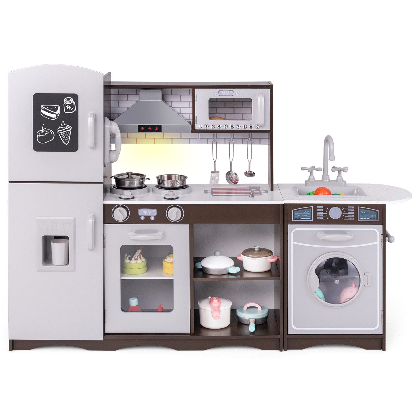 Unsere kinderfreundliche Spielküche bietet grenzenlosen Spaß und Kreativität. Mit realistischen Funktionen wie Kühlschrank, Dunstabzugshaube mit Licht- und Soundeffekten, Mikrowelle, Backofen, Waschmaschine, Spüle und verschiedenen Zubehörteilen garantieren stundenlanges Kochvergnügen. Die interaktiven Elemente wie klickende Drehknöpfe, drehbare Wasserhähne und eine Eiswürfelmaschine schaffen ein authentisches Spielerlebnis. Das beigefügte Telefon und die Kreidetafel fördern Rollenspiele und Kreativität. Großzügiger Stauraum hilft bei der Ordnung und unterstützt die Entwicklung sozialer und kognitiver Fähigkeiten. Diese Spielküche inspiriert spielerisch die Fantasie und gesunde Entwicklung Ihres Kindes.