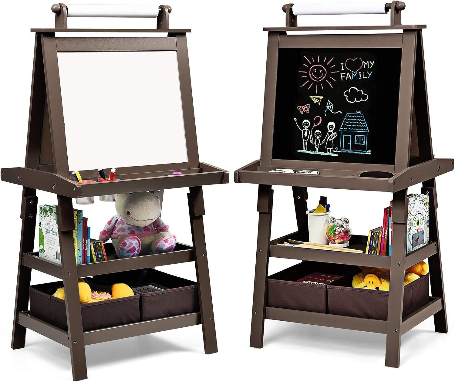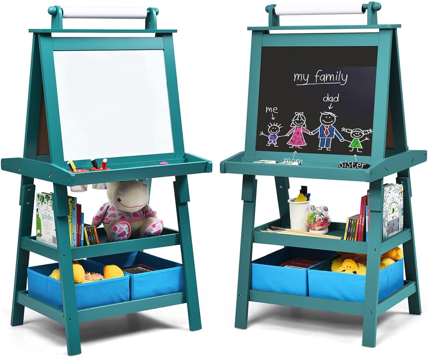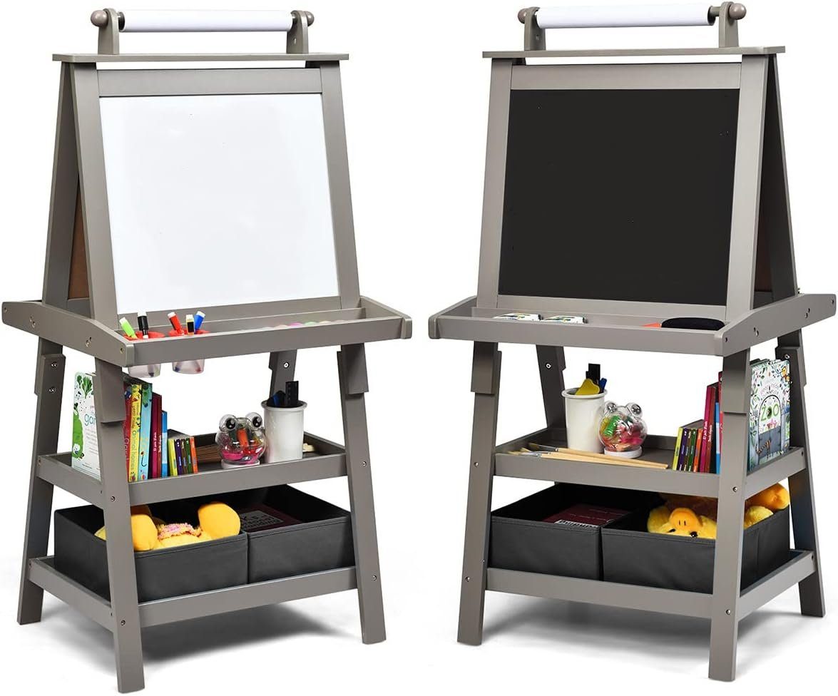 Die Staffelei ist doppelseitig gestaltet, eine Seite ist eine Tafel, die andere ist ein Whiteboard und es gibt auch ein Zeichenpapier. Kinder können nach Belieben darauf schaffen. Die dreieckige Struktur sorgt für die große Stabilität. Unter der Staffelei steht genügenden Platz für Kinder, damit die Malutensilien untergebracht werden.