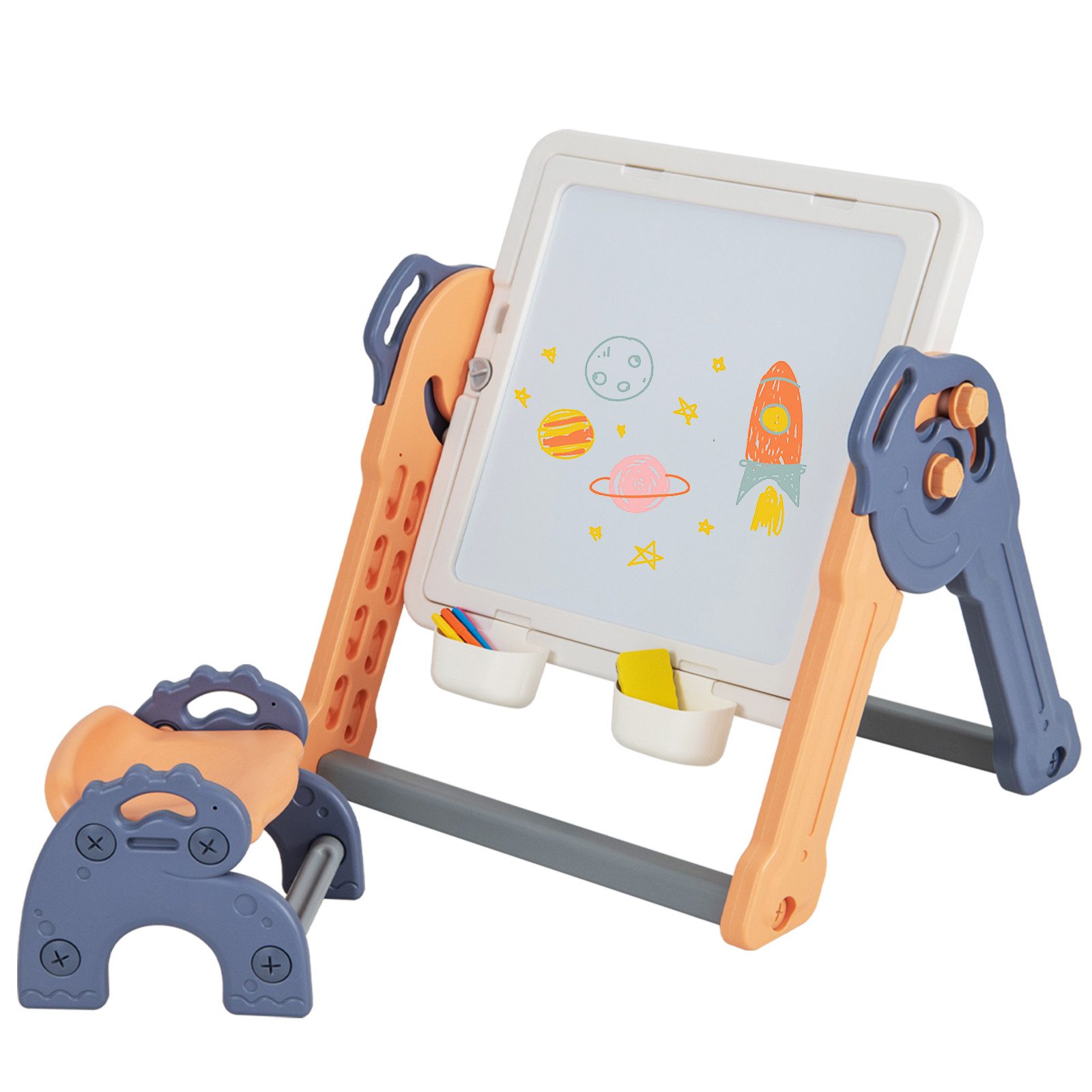 Dieses Tisch- und Stuhlset ist das perfekte Geschenk für Kinder im Alter von 3-8 Jahren. Es hat sichere, abgerundete Ecken für die Sicherheit der Kinder. Dank der stabilen Konstruktion können sowohl der Tisch als auch die Stühle ein Gewicht von 75 kg tragen. Die doppelseitige Tischplatte macht ihn nicht nur zu einer Staffelei, sondern auch zu einem Blocktisch, Lerntisch, Esstisch und mehr. Im Lieferumfang ist reichlich Zubehör enthalten, darunter Blöcke, Marker und Radiergummis. Dieses Set aus Kindertisch und -stuhl bietet Kindern einen großartigen Platz zum Malen, Spielen, Lernen, Schreiben oder Essen.